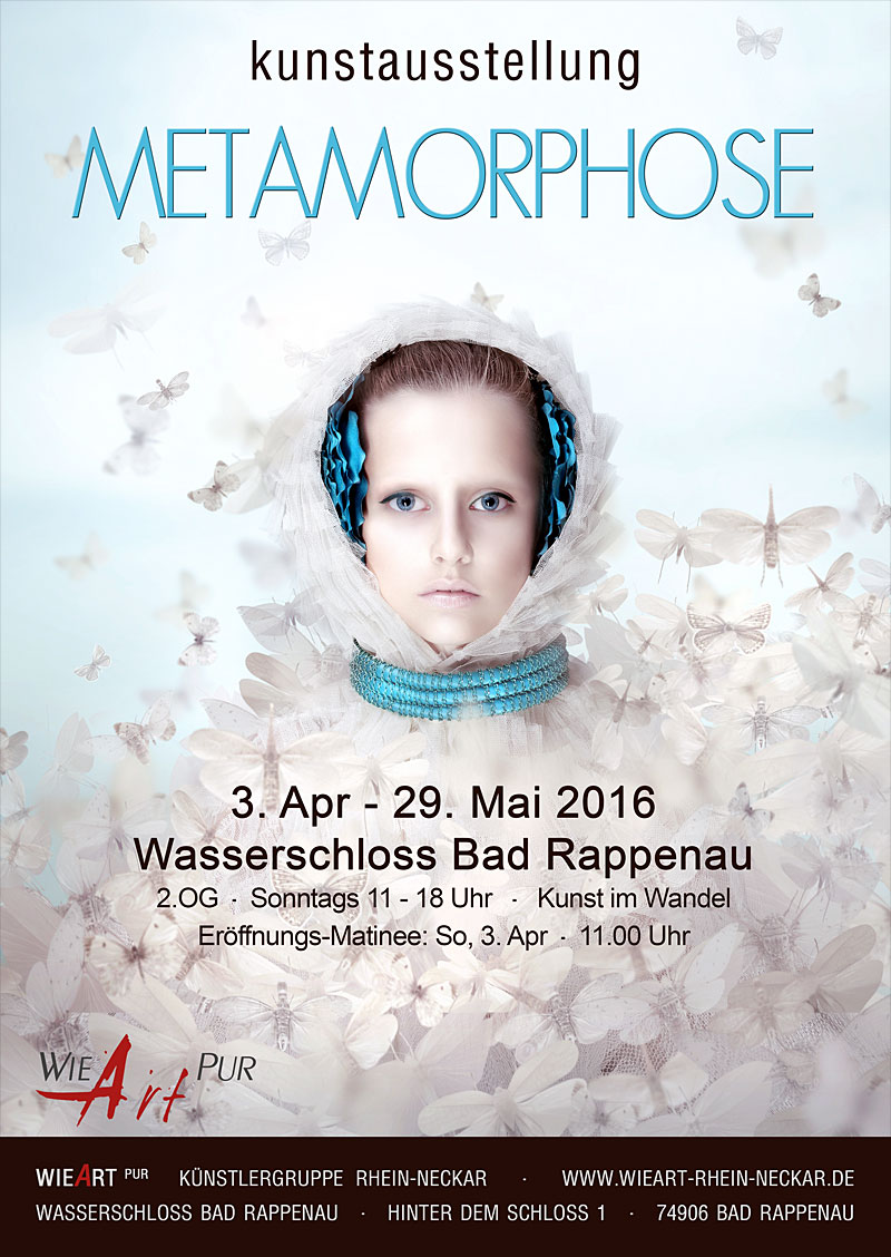 wieArt-METAMORPHOSE-Plakat-2016Die Künstlergruppe wieArt Rhein-Neckar wird sich im Ausstellungsjahr 2016 mit vier Einzelausstellungen präsentieren. Wir starten am 3. April, passend zum Frühling, mit der Ausstellung „Metamorphose“.