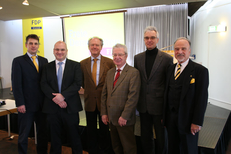 Auf dem Foto abgebildet sind v.l.: Dr. Jörg Richter (2. Vorsitzender des FDP-Ortsverbands, Gemeinderat Wiesloch) Jürgen Abt (1. Vorsitzender des FDP-Ortsverbands, Gemeinderat Rauenberg) Dr. Peter Hammacher (Ethikbeauftragter beim Vorstand von Transparency Deutschland) Klaus Rothenhöfer (Stellvertreter des Wieslocher Oberbürgermeisters) Hendrik Tzschaschel (1. Vorsitzender des FDP-Kreisverbands) Robert Blum (Vorstandsmitglied des FDP-Ortsverbands)