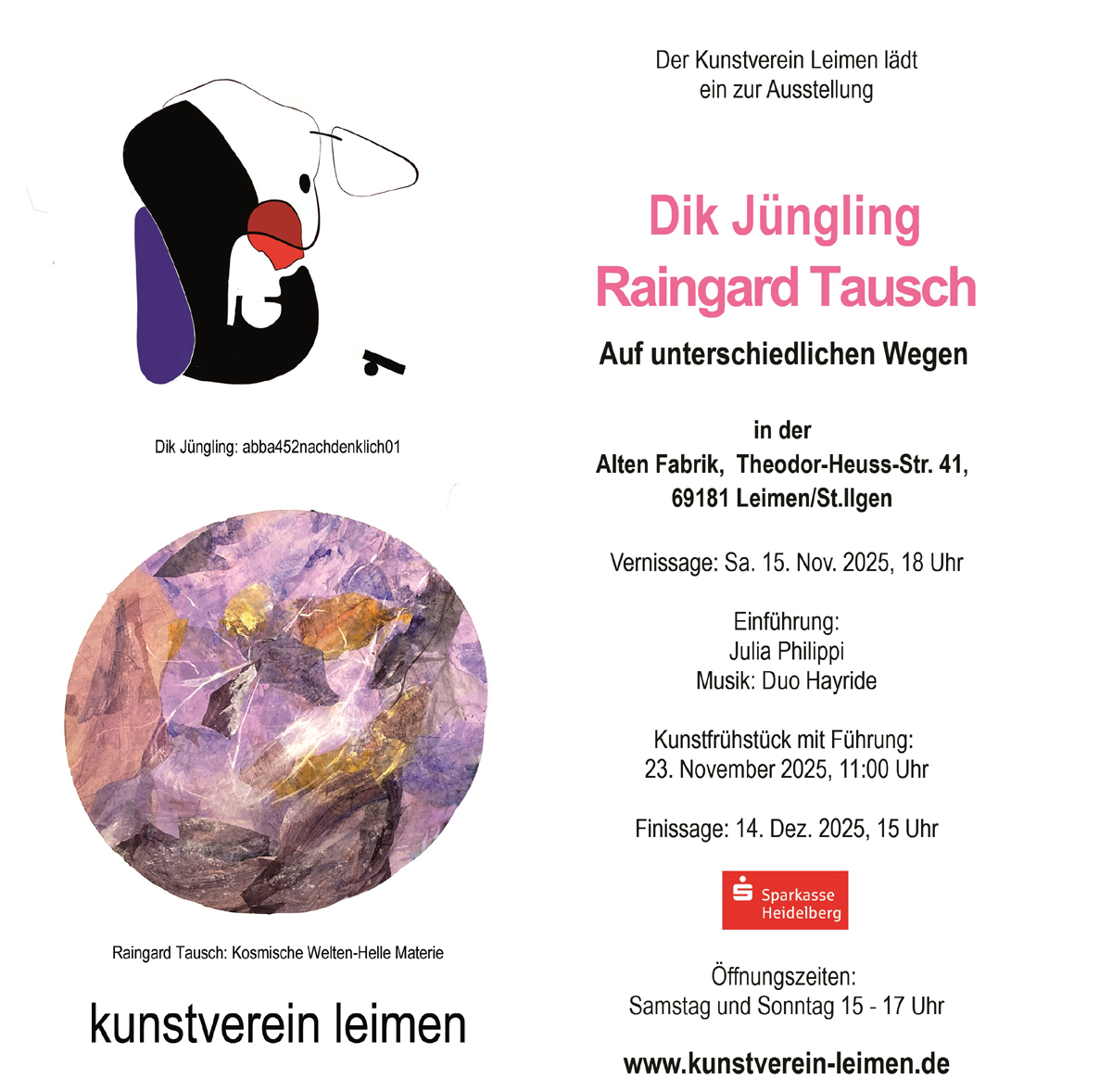 Der Kunstverein Leimen präsentiert vom 15. November bis 14. Dezember 2025 neue Arbeiten von Raingard Tausch und Dik Jüngling. Unter dem Titel AUF UNTERSCHIEDLICHEN WEGEN vereint die Ausstellung Malerei,  Zeichnungen, digitale Malerei, Objekte, Plastiken und Serien zu einer beeindruckenden Gesamtschau. Dabei werden zahlreiche Werke, die aktuell noch in Produktion sind, erstmals der Öffentlichkeit präsentiert.