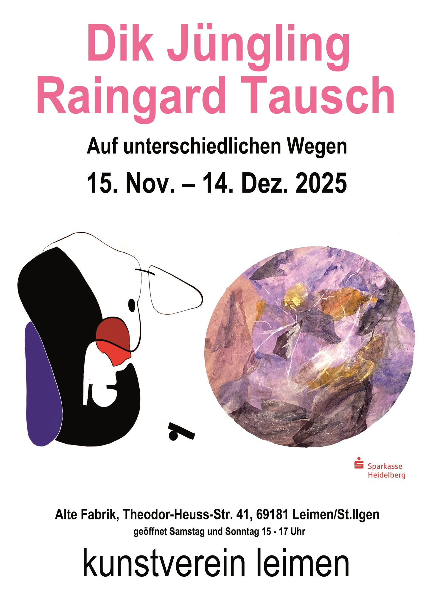 Der Kunstverein Leimen präsentiert vom 15. November bis 14. Dezember 2025 neue Arbeiten von Raingard Tausch und Dik Jüngling. Unter dem Titel AUF UNTERSCHIEDLICHEN WEGEN vereint die Ausstellung Malerei,  Zeichnungen, digitale Malerei, Objekte, Plastiken und Serien zu einer beeindruckenden Gesamtschau. Dabei werden zahlreiche Werke, die aktuell noch in Produktion sind, erstmals der Öffentlichkeit präsentiert.