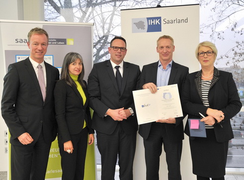 v.l.n.r. Dr. Carsten Meier, Geschäftsführer der IHK Saarland, Petra Krenn, Vizepräsidentin der IHK Saarland, Stephan Kolling, Staatssekretär im Sozialministerium, Peter Grendel, Geschäftsführer von abat+ und Ute Knerr von der Servicestelle Arbeiten und Leben. Quelle: ©IHK Saarland