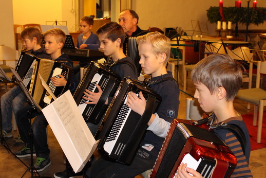 Insbesondere die immer größere Cello-Abteilung sei ein Alleinstellungsmerkmal, worauf man stolz sein könne, so Strangmann. Zunächst waren jedoch die fünf Jungs des Akkordeonensembles unter der Leitung von Viktor Köhnke mit einer jungen Pianistin als Begleitung zu hören.