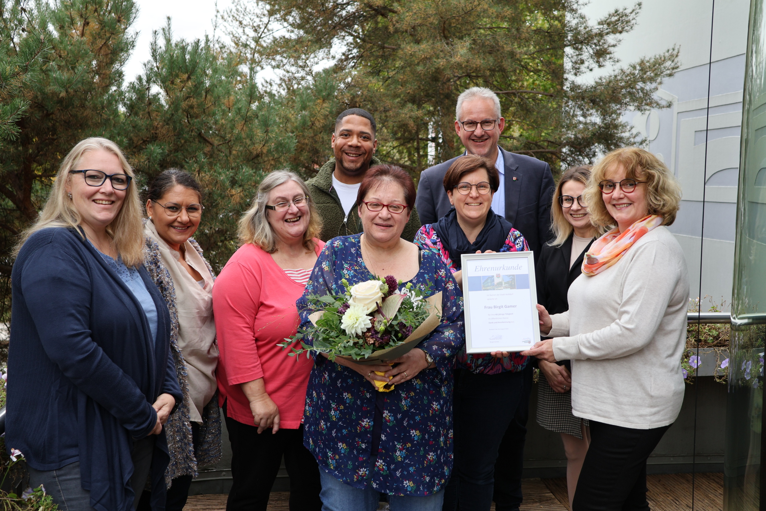 Viele Glückwünsche für Jubilarin Birgit Gamer (mit Blumen): (von links) Beate Bender-Emmerling, Özlem Dogan, Martina Kraus, Dominik Otto, Viola Bierlein, Bürgermeister Matthias Renschler, Agnieszka Grosicka und Elke Kneis