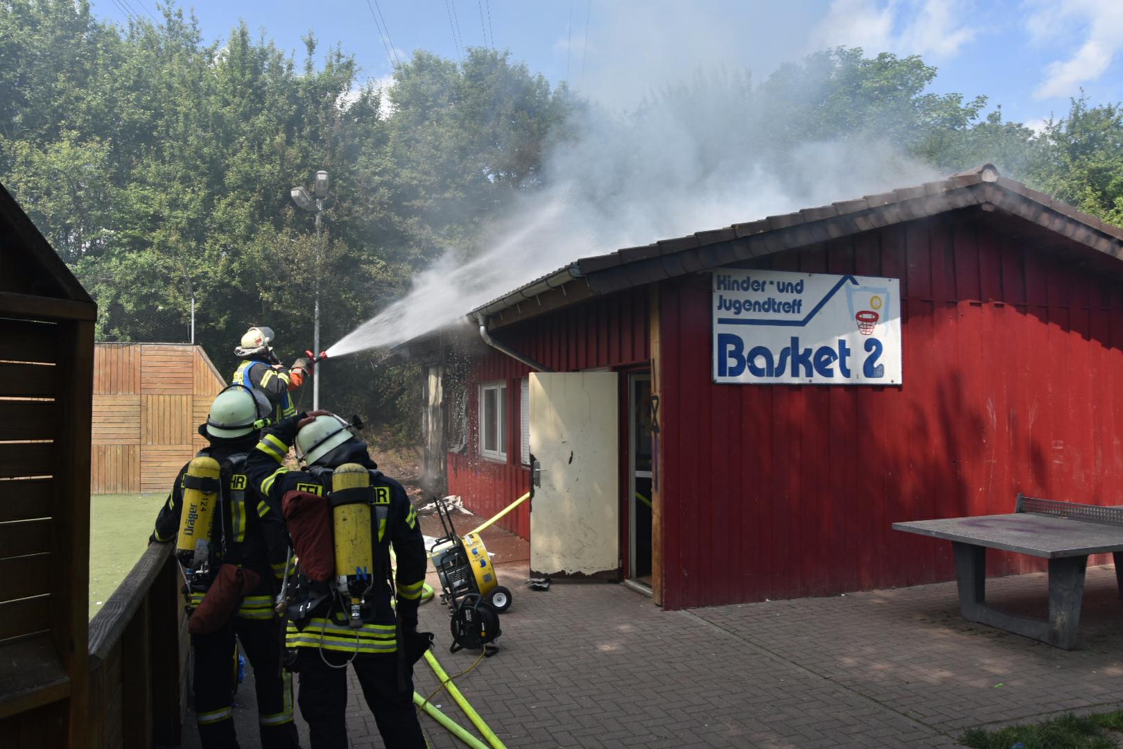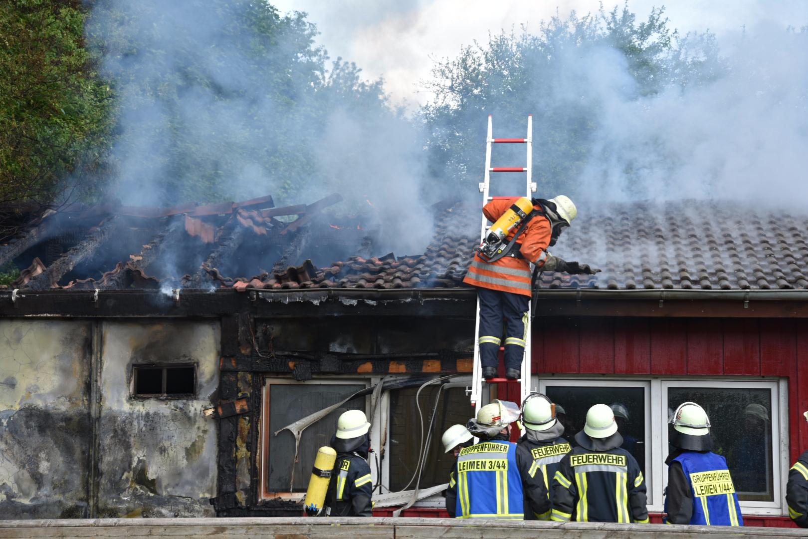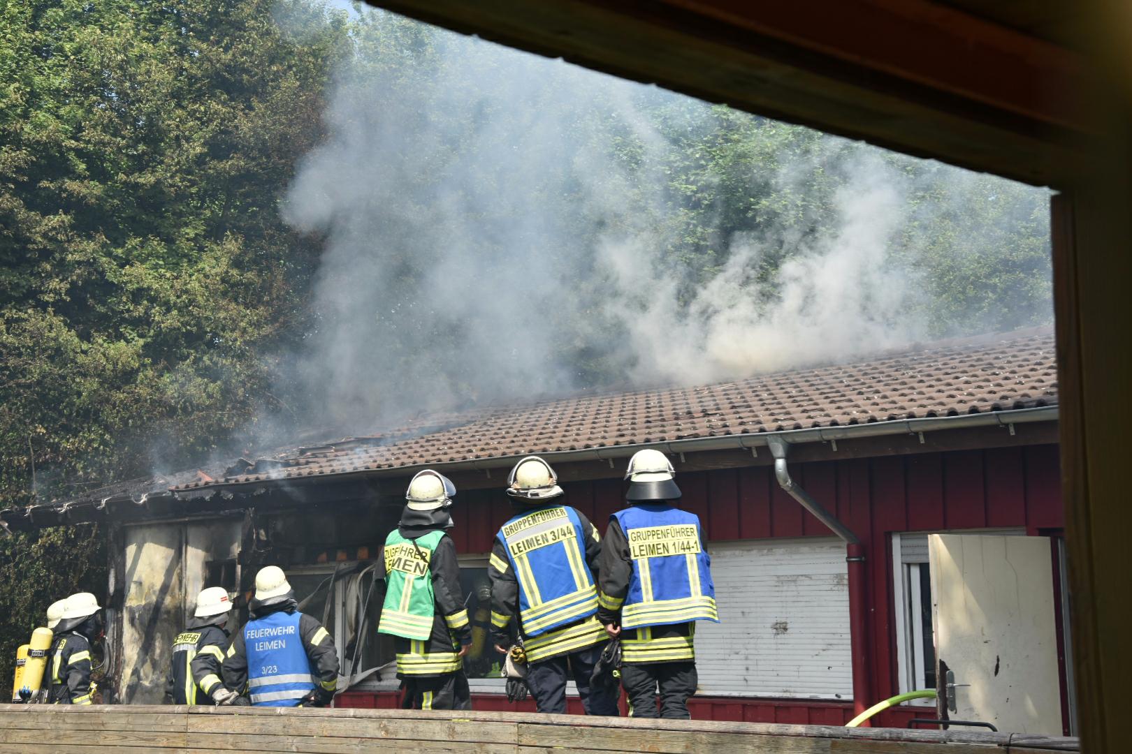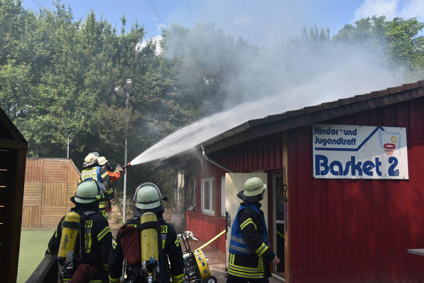 (fwu – 10.5.15 | 12.00 Uhr) Gegen 11:30 Uhr am heutigen Sonntag wurde die Feuerwehr Leimen durch die zentrale Leitstelle über einen Brand im Jugendtreff Basket in der Fasanerie in Leimen informiert. Kurze Zeit später trafen die Einsatzkräfte am Brandort ein und fanden das Gebäude des Basket im hinteren Teil im Vollbrand befindlich. Unter schwerem Atemschutz kämpften sich die Feuerwehrleute zum Brandherd vor und begannen mit den Löscharbeiten, die zum gegenwärtigen Zeitpunkt noch andauern. Das Gebäude des Basket dürfte nach Beendigung der Löscharbeiten abbruchreif sein. Die Brandursache ist derzeit noch unklar, Brandstiftung wird jedoch nicht ausgeschlossen.