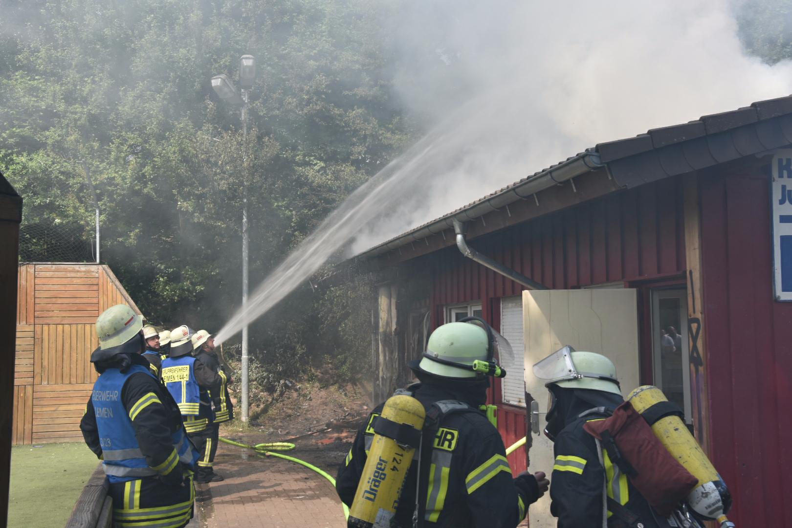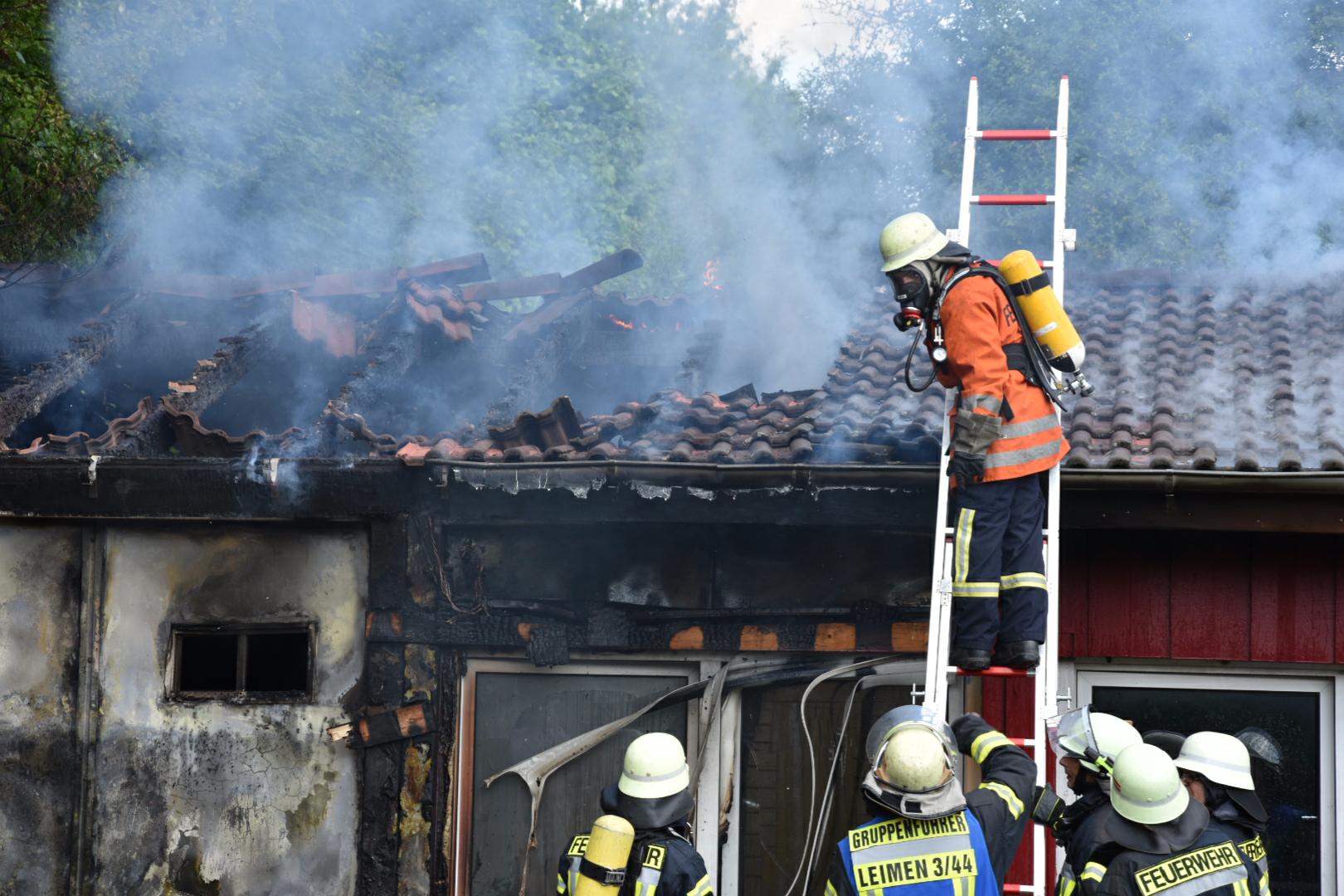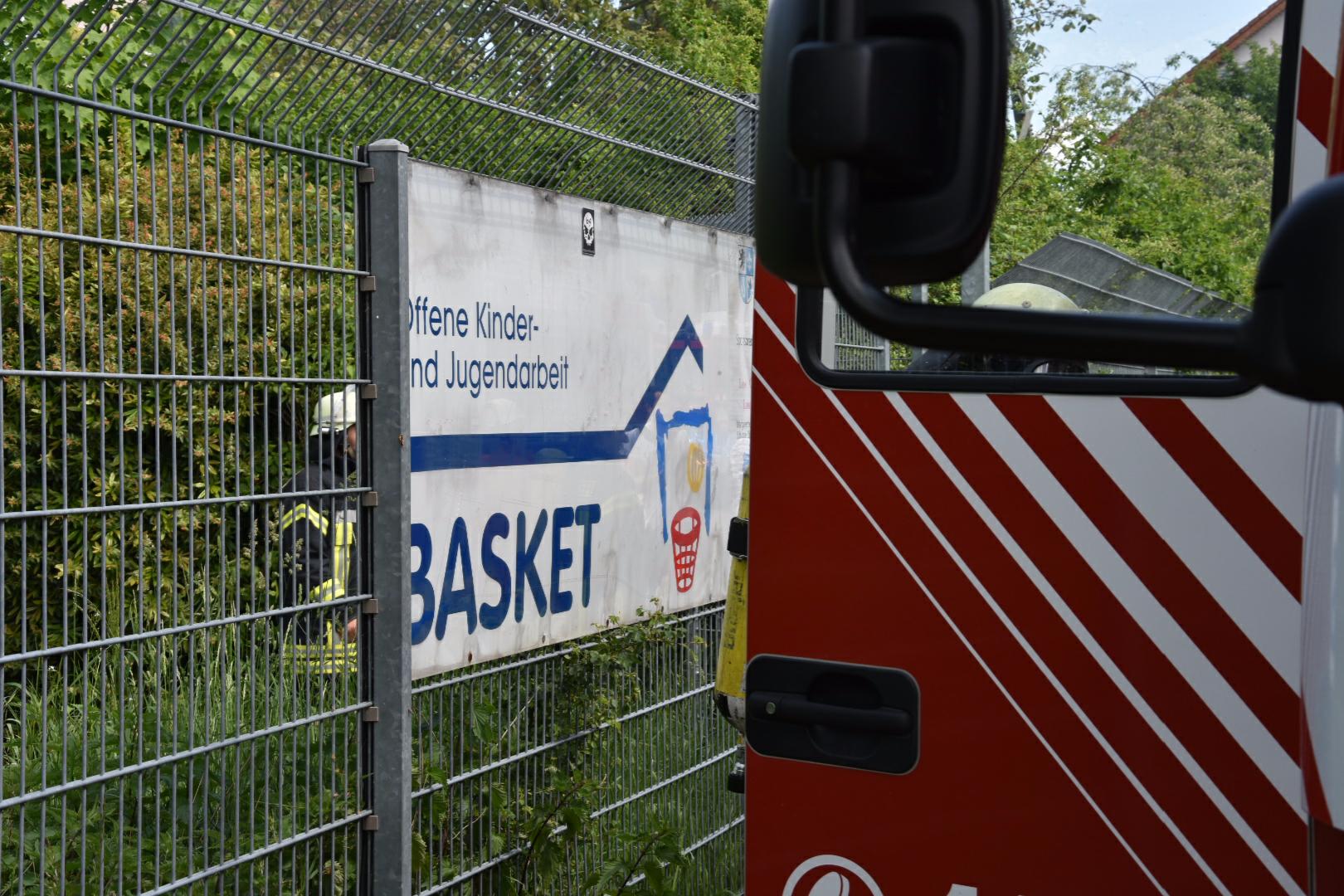 (fwu – 10.5.15 | 12.00 Uhr) Gegen 11:30 Uhr am heutigen Sonntag wurde die Feuerwehr Leimen durch die zentrale Leitstelle über einen Brand im Jugendtreff Basket in der Fasanerie in Leimen informiert. Kurze Zeit später trafen die Einsatzkräfte am Brandort ein und fanden das Gebäude des Basket im hinteren Teil im Vollbrand befindlich. Unter schwerem Atemschutz kämpften sich die Feuerwehrleute zum Brandherd vor und begannen mit den Löscharbeiten, die zum gegenwärtigen Zeitpunkt noch andauern. Das Gebäude des Basket dürfte nach Beendigung der Löscharbeiten abbruchreif sein. Die Brandursache ist derzeit noch unklar, Brandstiftung wird jedoch nicht ausgeschlossen.