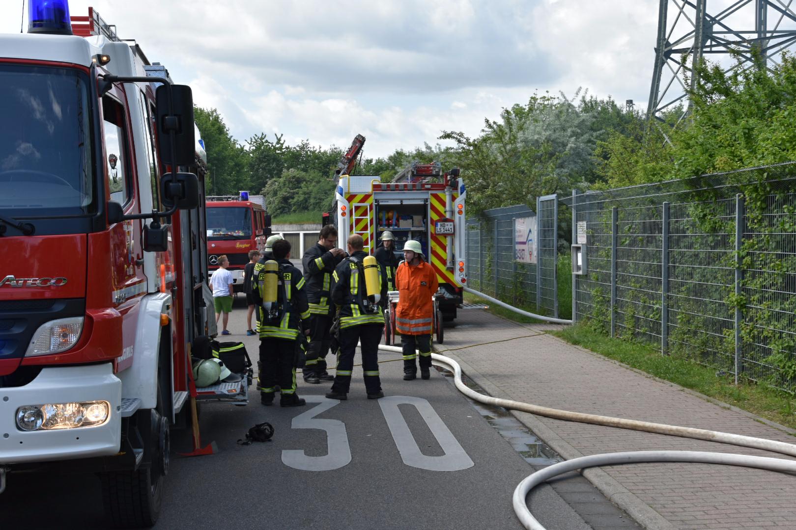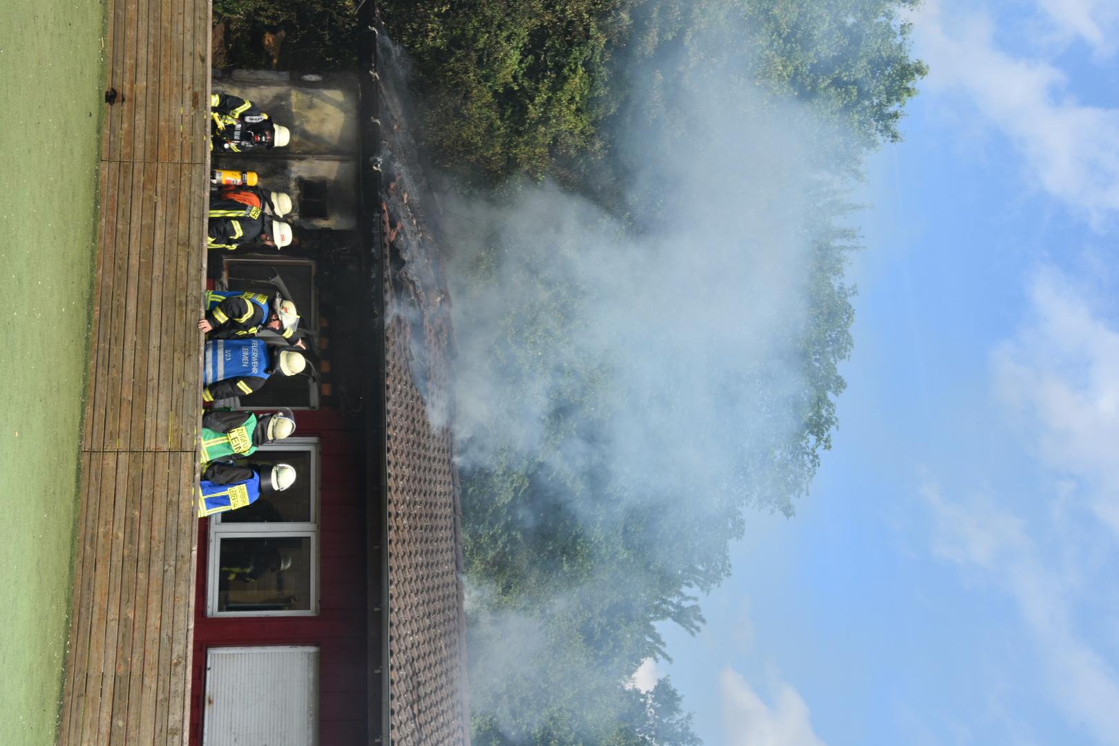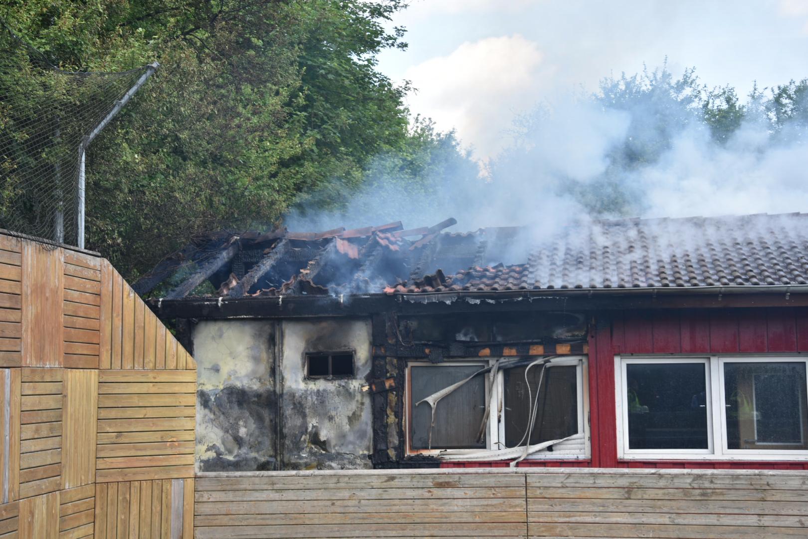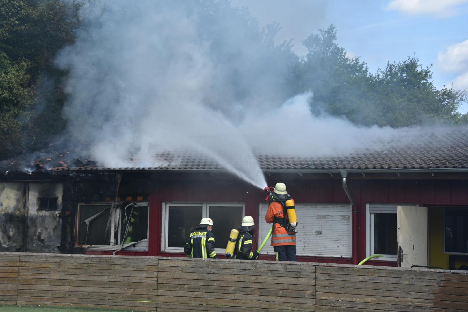 (fwu – 10.5.15 | 12.00 Uhr) Gegen 11:30 Uhr am heutigen Sonntag wurde die Feuerwehr Leimen durch die zentrale Leitstelle über einen Brand im Jugendtreff Basket in der Fasanerie in Leimen informiert. Kurze Zeit später trafen die Einsatzkräfte am Brandort ein und fanden das Gebäude des Basket im hinteren Teil im Vollbrand befindlich. Unter schwerem Atemschutz kämpften sich die Feuerwehrleute zum Brandherd vor und begannen mit den Löscharbeiten, die zum gegenwärtigen Zeitpunkt noch andauern. Das Gebäude des Basket dürfte nach Beendigung der Löscharbeiten abbruchreif sein. Die Brandursache ist derzeit noch unklar, Brandstiftung wird jedoch nicht ausgeschlossen.