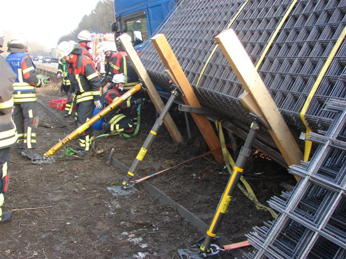 Somit stand für die Besatzung des Rüstzuges vor allem das Sichern des LKWs im Vordergrund: Es kam das neue Abstützsystem „Paratech“ zum Einsatz, das der neue Rüstwagen mit sich führt.