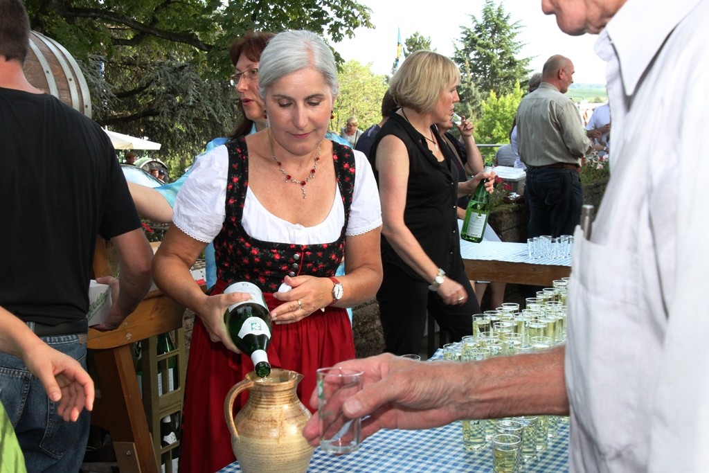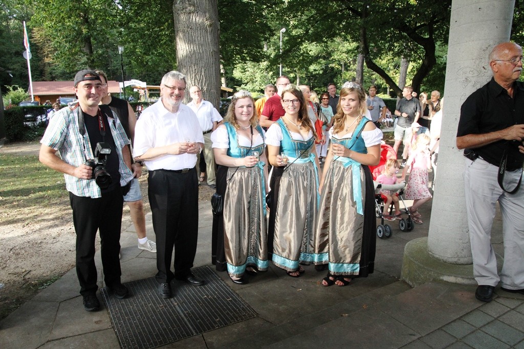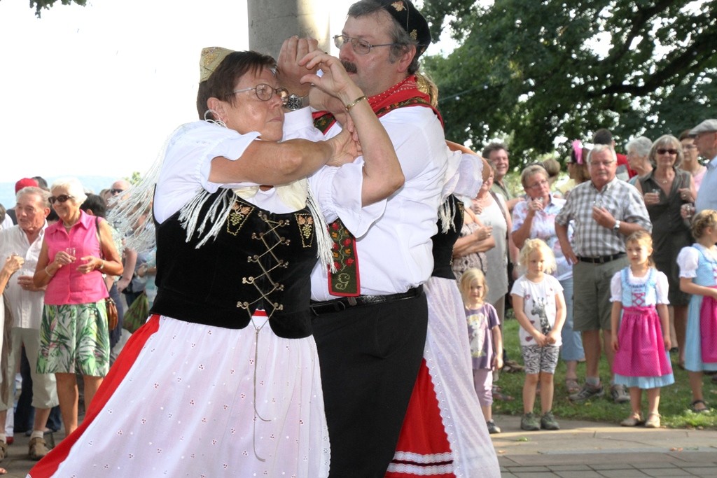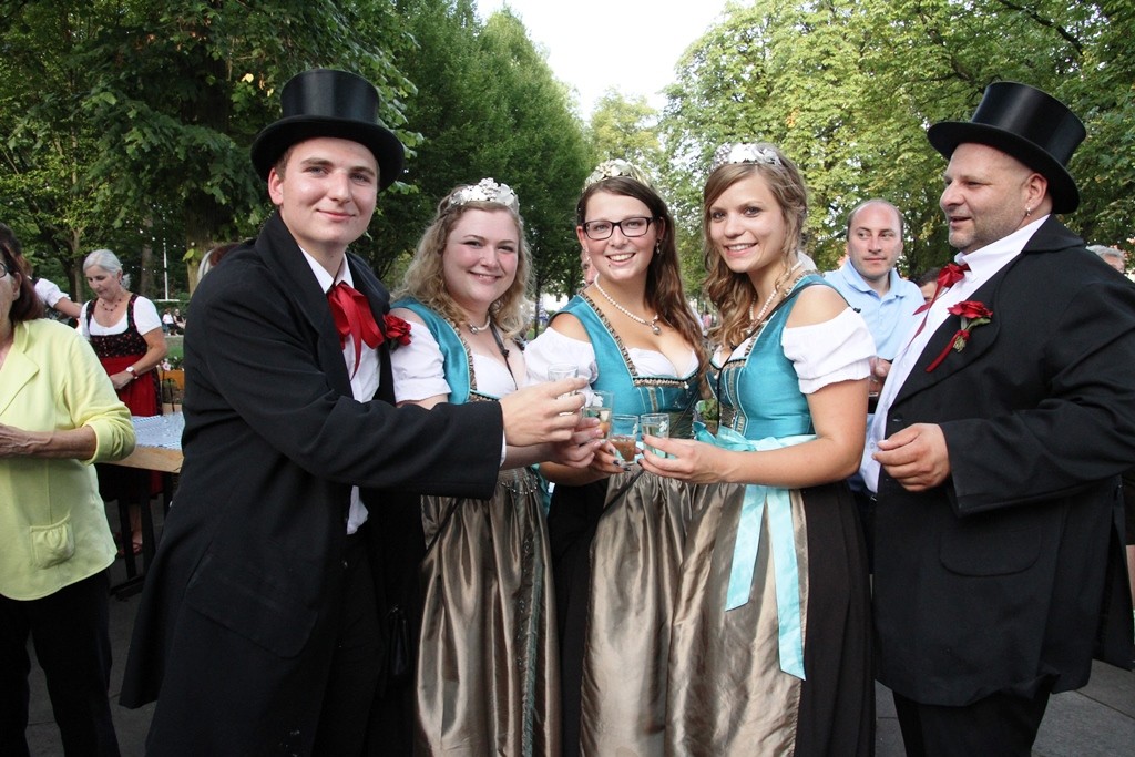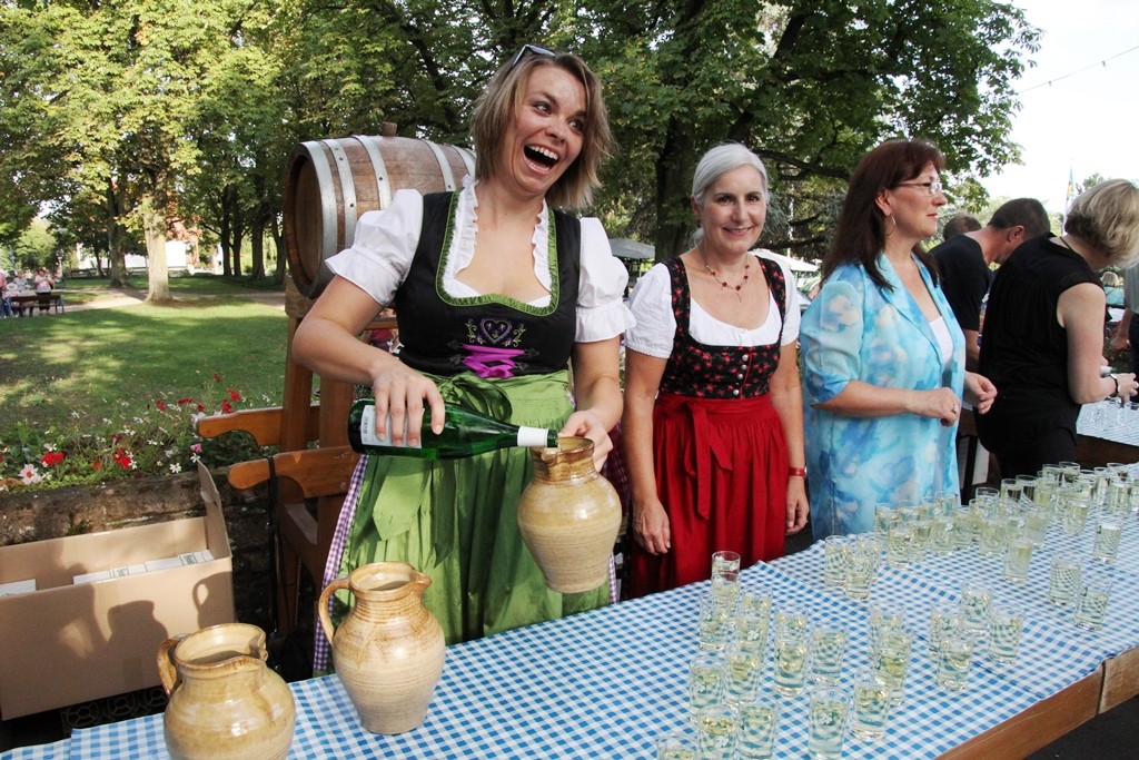 (red) Sehnsüchtig erwartet – die offizielle Eröffnung des Winzerfestes 2015 – heute war es soweit. Mit einem Rundgang der amtierenden Weinhoheiten und geladenen Gästen des Oberbürgermeister Franz Schaidhammer, daran anschliessend im Gerbersruh-Park die feierliche Eröffnung mit einem kleinen Umtrunk des köstlichen Weins des Winzerkeller, einer kurzen Ansprache der Weinkönigin sowie OB Schaidhammer wurde das Winzerfest eröffnet. Natürlich durfte die obligatorische Darbietung der Volkstanzgruppe nicht fehlen, welche die anwesenden Gäste, ich denke so ca. 300 kleine und große Anhänger des Weinfestes werden wohl vor Ort gewesen sein, mit ihren anstrengenden und schweißtreibenden Reigen erfreuten. Ich habe so einige Male gehört, dass wohl Wasser mehr verköstigt werden wird als Wein, dabei hob man sicher auf die Temperaturen ab, die sich wieder jenseits der 30 Grad Marke bewegten.