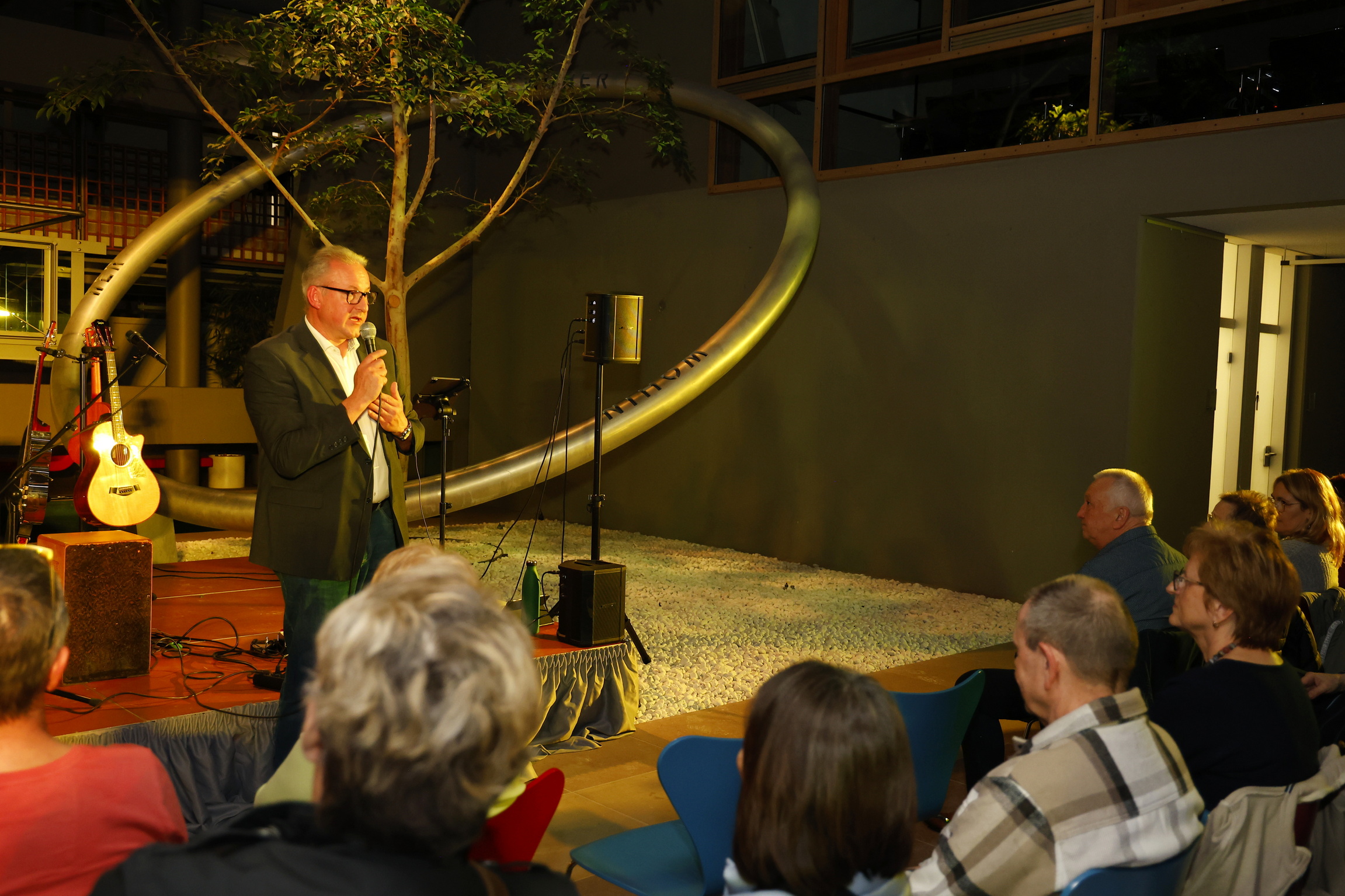 Begrüßt werden die über hundert Zuhörinnen und Zuhörer zweieinhalb Stunden vorher vom Hausherren, Bürgermeister Matthias Renschler. Er verspricht in guter Voraussicht „ein wunderbares Konzert“ und „einen tollen Abend“, freut sich, „so viele Menschen bei uns im Rathaus zu sehen“, und dankt allen, die fürs Gelingen zuständig sind: Neben den drei Musikern vor allem den Verantwortlichen des Kulturfördervereins Kurpfalz, namentlich Eddie und Daniel Berlinghof, sowie von städtischer Seite dem Fachdienst Kultur und Sport. Im „Wohnzimmer“ von Cool Breeze, die im Rathaus schon viele, viele Konzerte gespielt haben, begrüßt auch Eddie Berlinghof fürs Swingin‘-WiWa-Team die zahlreichen Zuhörer, dankt ihnen fürs Kommen und rührt die Werbetrommel für die weiteren Veranstaltungen des Musikfestivals: Bis 10. Mai gibt es in Walldorf und den Nachbarkommunen noch viele weitere Konzerte zu hören.