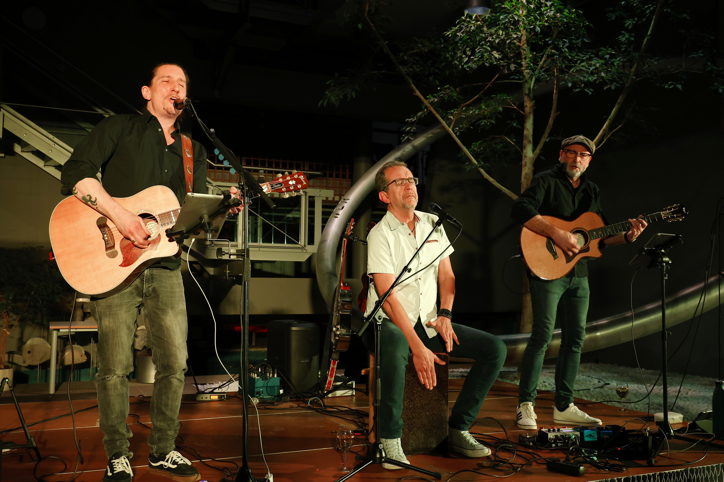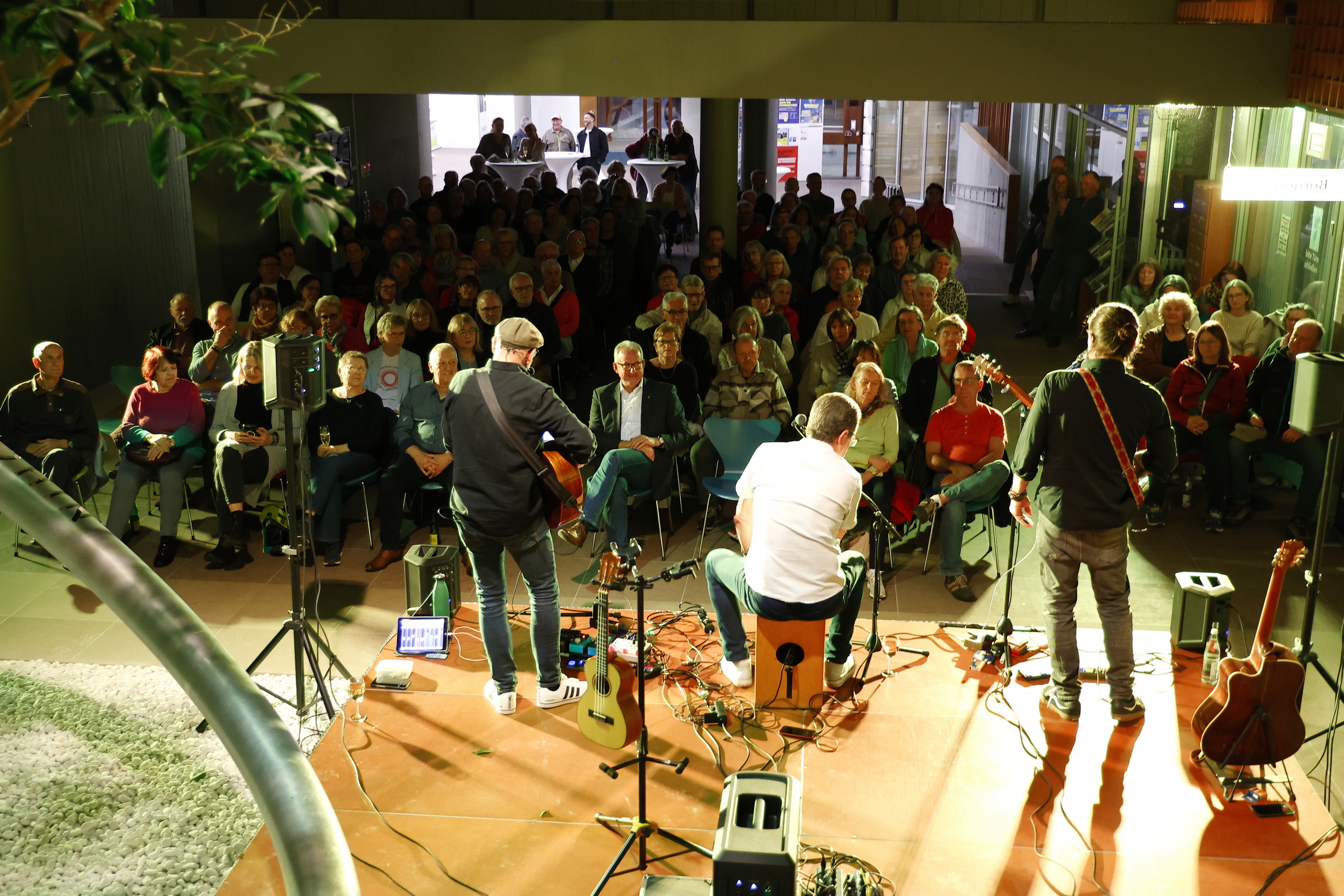 Melancholisch, aber nicht düster, nostalgisch, aber keineswegs altbacken, immer harmonisch und mit der freundlichen Einladung, sich wohlzufühlen. Auf Cool Breeze ist Verlass, die Band füllt wieder einmal mühelos das Rathaus-Foyer, und sie verzaubert vor allem ihr Publikum auf die bewährte Art und Weise. Mit sanften Akustik-Gitarrenklängen, für die die beiden Ur-Mitglieder Stefan Zirkel und Fabian Michel zuständig sind, und dreistimmigem Gesang, bei dem sich Stefan Buchholz als Dritter im Bunde hinzugesellt. „Buchi“ hat außerdem das Cajón in seiner Gewalt, die aus Holz gefertigte Trommelkiste, auf der er beim Spielen sitzt oder sitzend spielt. Das „Vogelhäuschen“, wie es Stefan Zirkel mit dem Schalk im Nacken nennt (und den Ausspruch seiner Schwiegermutter zuschreibt), gibt dem bewährten Sound von Cool Breeze eine ganz eigene Note.