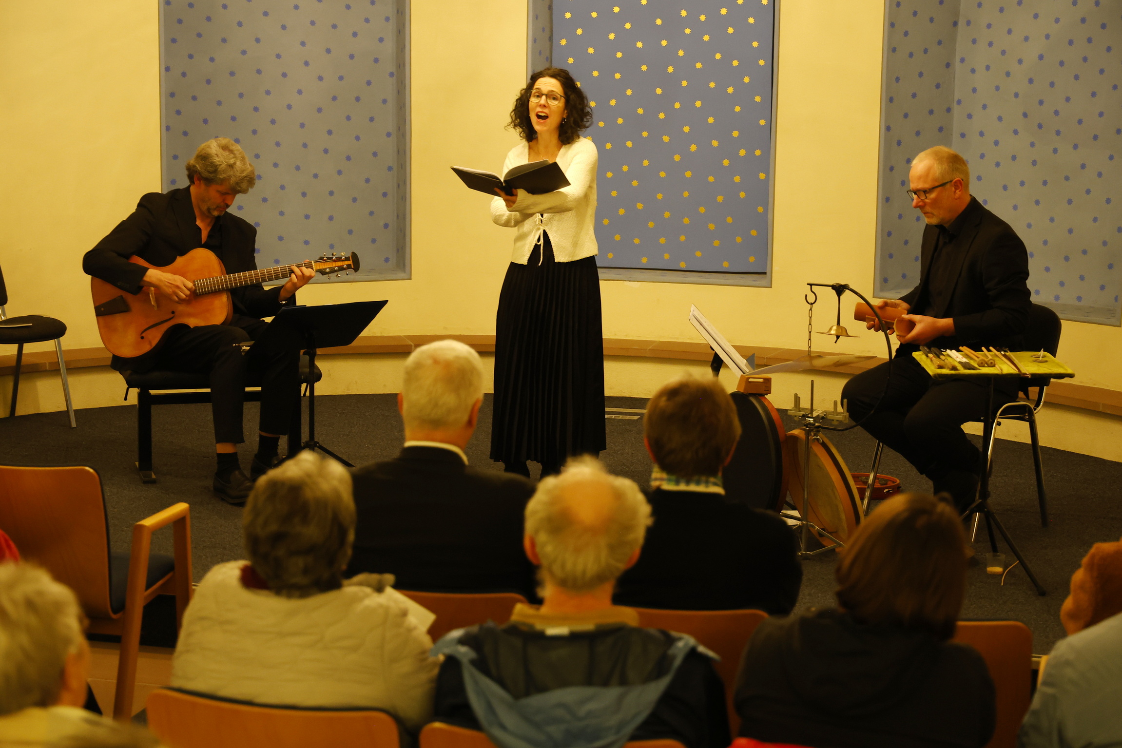 Für den Herzschlag des Ensembles und eine jeweils ganz besondere Klangfarbe sorgte Eger an den diversen Percussions-Instrumenten wie Rahmentrommeln, Tamburin, Becken, Holzblöcken, Zimbeln und Kastagnetten. Die drei Musiker harmonierten bestens zusammen und sind ganz offensichtlich hervorragend aufeinander eingespielt, auch wenn sie ihr gemeinsames Ensemble erst 2022 gründeten. Kein Wunder, denn Arend und Telletxea sind ein Ehepaar und Eger ist ein Jugendfreud Arends. Ihre Freude am Muszieren und Singen war deutlich zu spüren und inspirierte das Publikum.