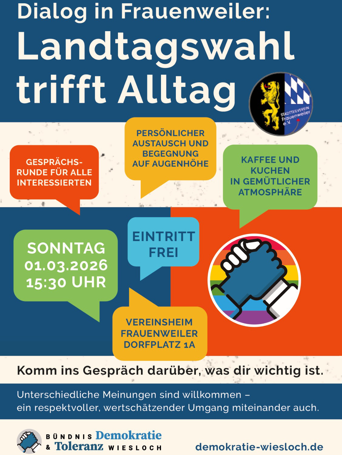 Im Vorfeld der Landtagswahl am 08. März 2026 laden der Stadtteilverein Frauenweiler und das Bündnis Demokratie und Toleranz Wiesloch e.V. zu einem offenen Gespräch bei Kaffee und Kuchen ein.