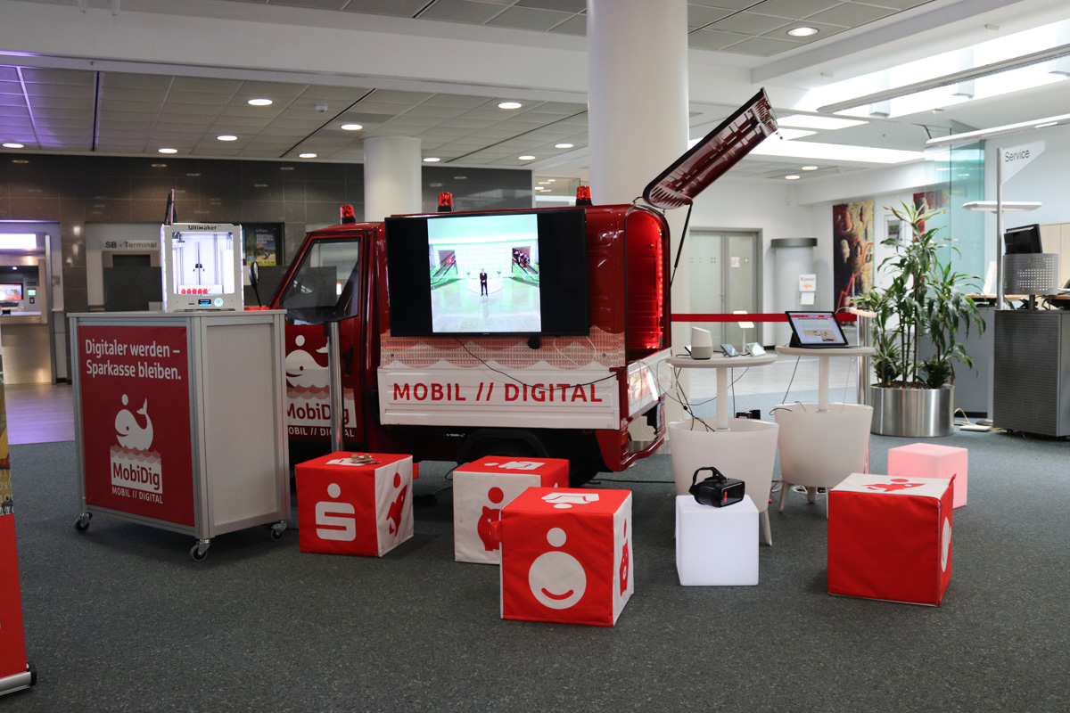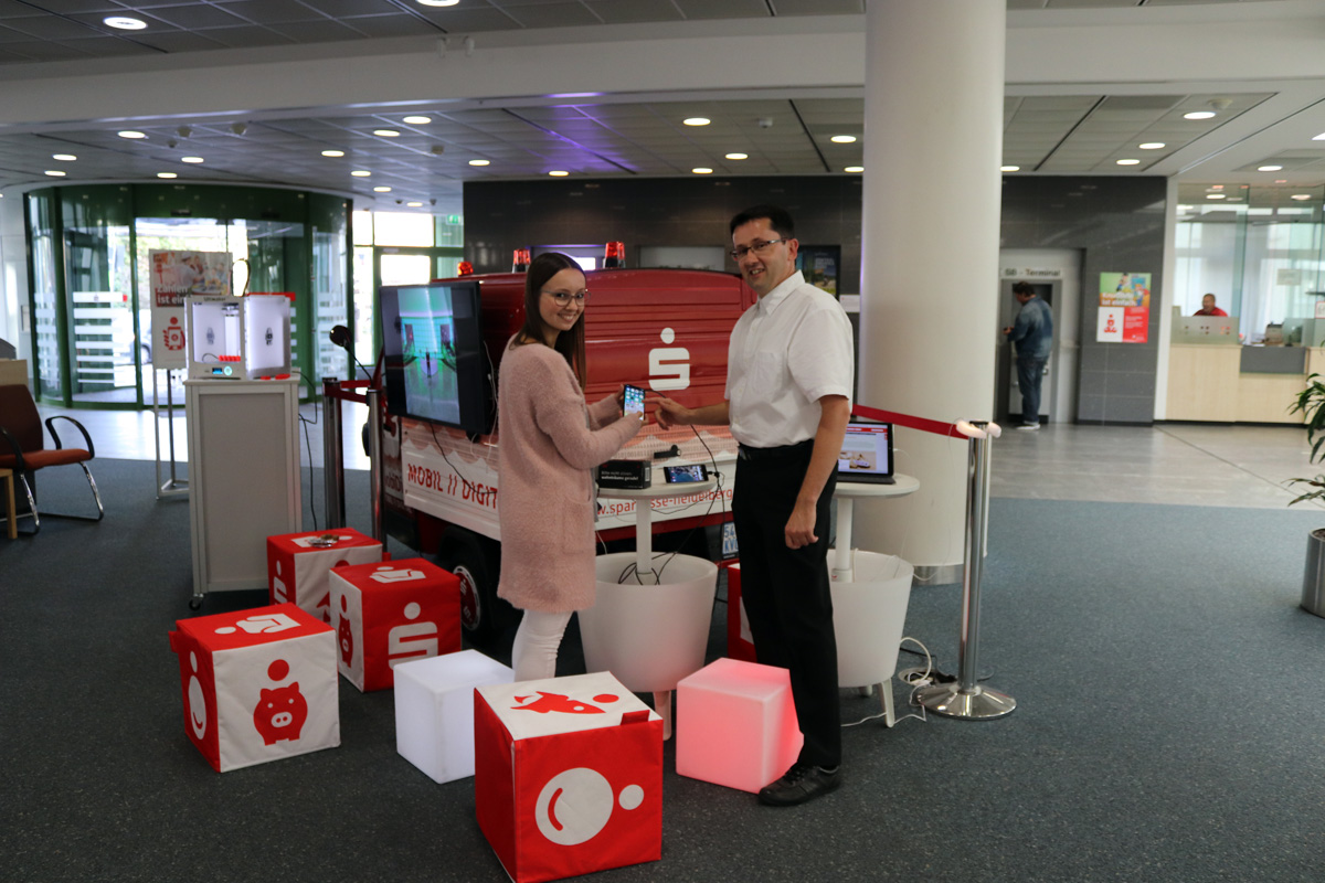 Neben diesen Beispielen moderner Technik, transportiert MobiDig aber auch vor allem Technologie – das Wissen um die Technik und deren Anwendung, wird von den geschulten und technikaffinen Sparkassen- Mitarbeitern an Kunden und Interessierte weitergegeben.