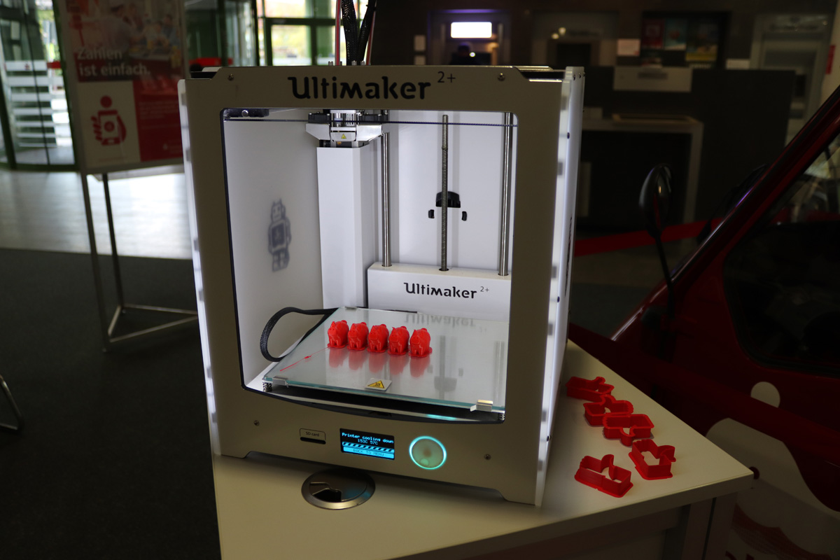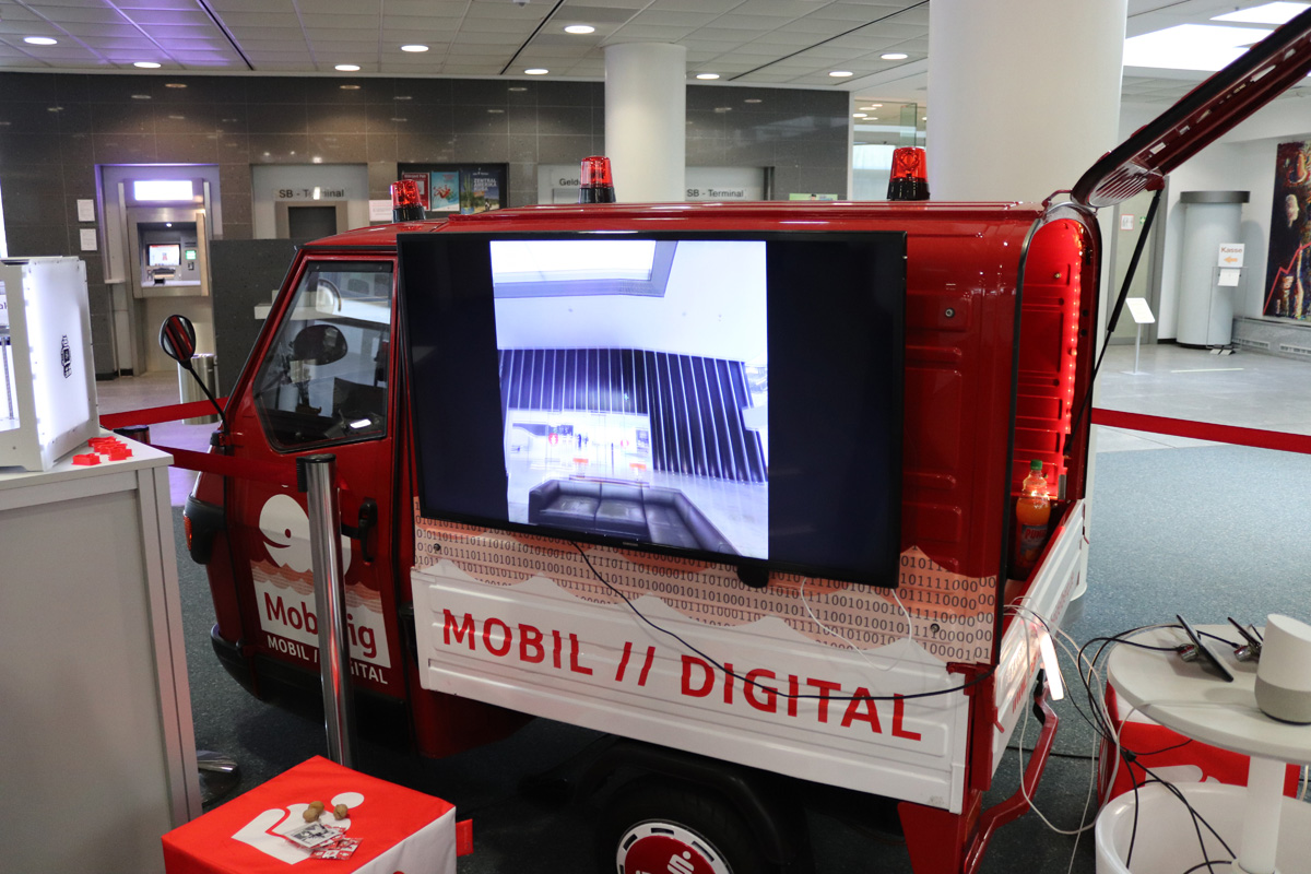 Beladen ist das kultige Rollermobil in der Sparkassen-Version mit allerlei digitalen Geräten, vom Laptop über Tablet-PCs, iPads und verschiedensten Smartphones bis hin zu Virtuality-Reality-Brillen sowie Sprachassistenten und 3D-Drucker.