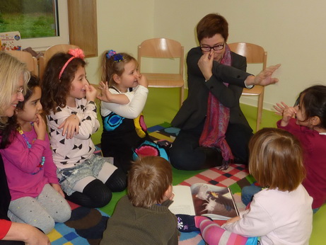 Eine-Welt-KiGa-4Wiesloch. Geschichten öffnen Türen. Im Rahmen des „Bundesweiten Vorlesetags 2015“ besuchte die Landtagskandidatin Andrea Schröder-Ritzrau den Eine-Welt-Kindergarten in Wiesloch.