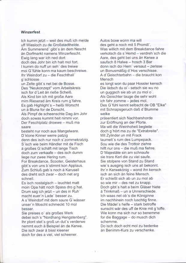 In feinster Mundart wird „gefrotzelt“ (mit spöttischen Bemerkungen necken) – Kritische aber ehrliche Worte des Dorfes an die Stadt. Aber auch aus der Seele vieler Wieslocher gesprochen.