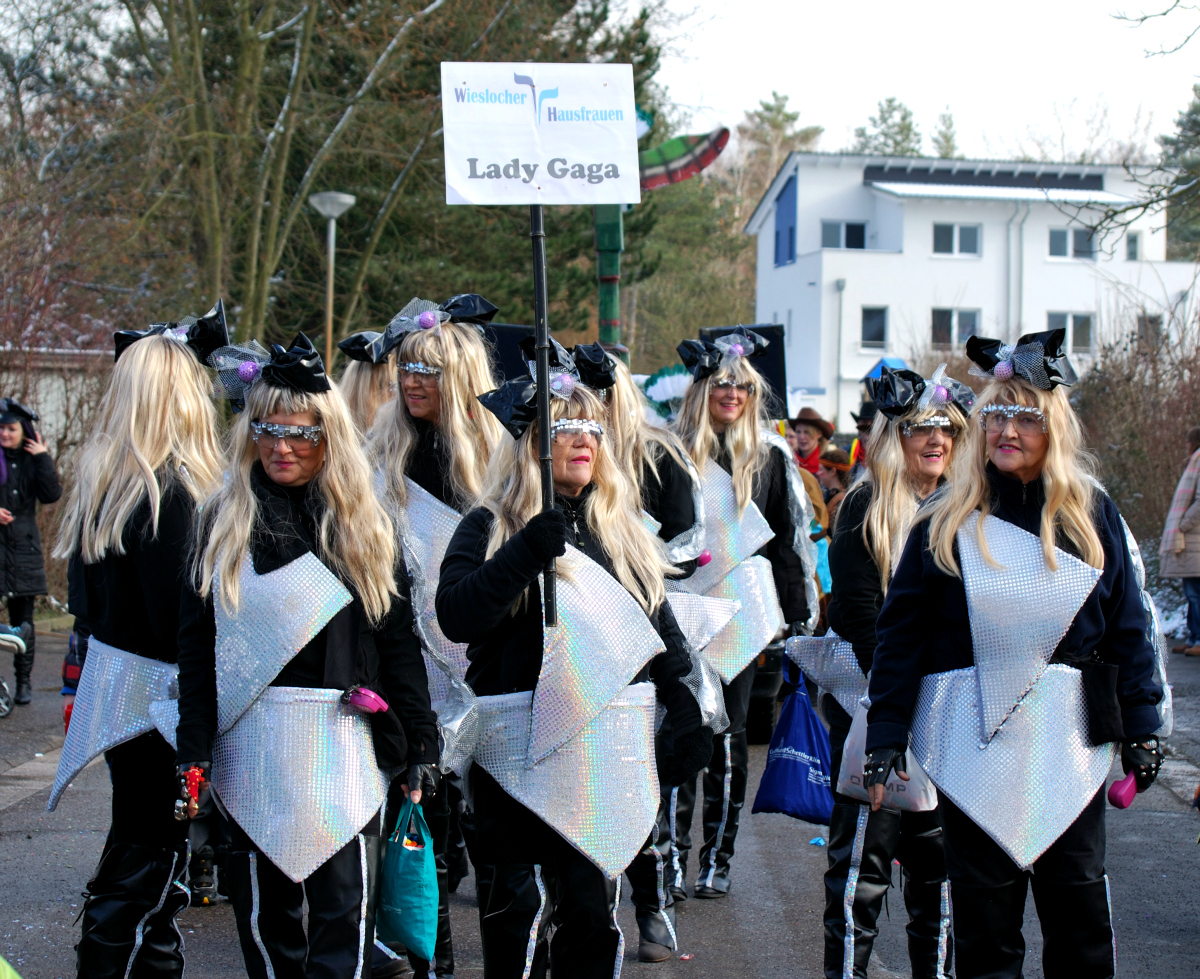 Thematisch erfolgte daraufhin ein großer Sprung nach Ägypten, als der FC Bambini in Mumien- und Pharaonenkostümen vorbeizog. Richtig Gaga wurde es, als die Hausfrauen Wiesloch, die allesamt als Lady Gaga verkleidet waren, für Stimmung sorgten.