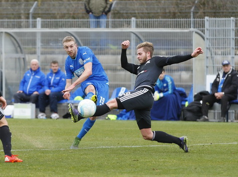 Fussball. Regionalliga Suedwest. Saison 2015-2016. 21. Spieltag. FC Astoria Walldorf – SV Saar 05. Tor zum 1:0 fuer Walldorf durch Marcus Meyer (FCA Walldorf, links). Keine Chance an den Ball zu kommen fuer Kristoffer Krauss (Saar). 05.03.2016 – Jan A. Pfeifer – 01726290959