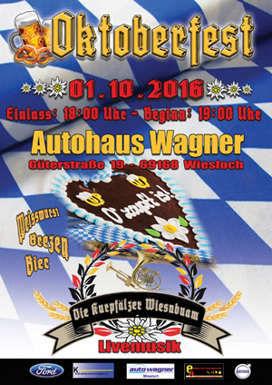 „O‘Zapft is!“, heißt es am Samstag, 1. Oktober 2016, ab 19 Uhr, bei Auto-Wagner (Einlass ist bereits um 18 Uhr). Das Wieslocher Ford- und Volvo-Autohaus lädt zum zünftigen Oktoberfest in seine Räume und Hallen in.