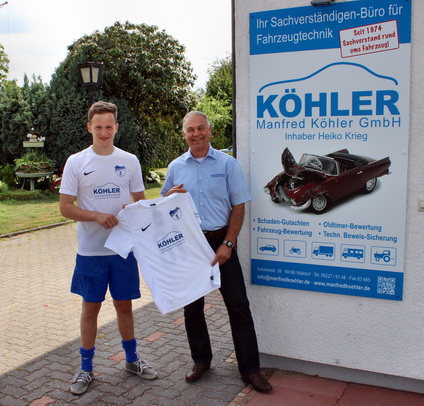 VfB KöhlerAnlässlich eines Besuchs bei der Firma Manfred Köhler GmbH, Ihr Sachverständigenbüro für Fahrzeugtechnik, in Walldorf überreichte Geschäftsführer Heiko Krieg dem 1. Mannschaftsspieler Max Haberkern einen neuen Satztrikot für die 1. Herrenmannschaft des VfB Wiesloch.