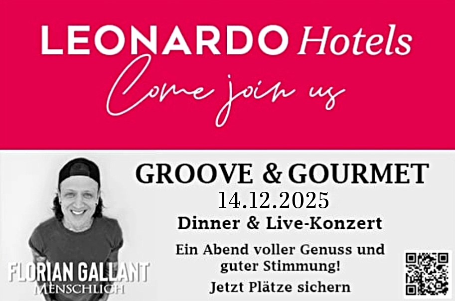 Erleben Sie die perfekte Kombination aus erstklassigem Dinner und Live-Musik in stilvollem Ambiente. Dieser Abend verspricht ein Erlebnis für alle Sinne – ideal für Musikliebhaber und Genießer gleichermaßen. Sichern Sie sich rechtzeitig Ihre Tickets und lassen Sie sich von Florian Gallant und kulinarischen Highlights verwöhnen.