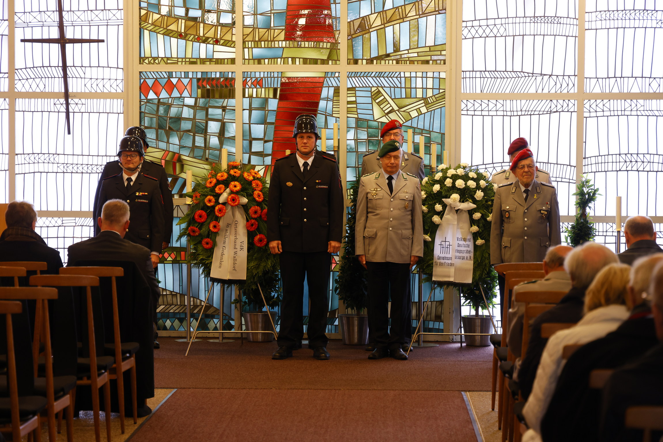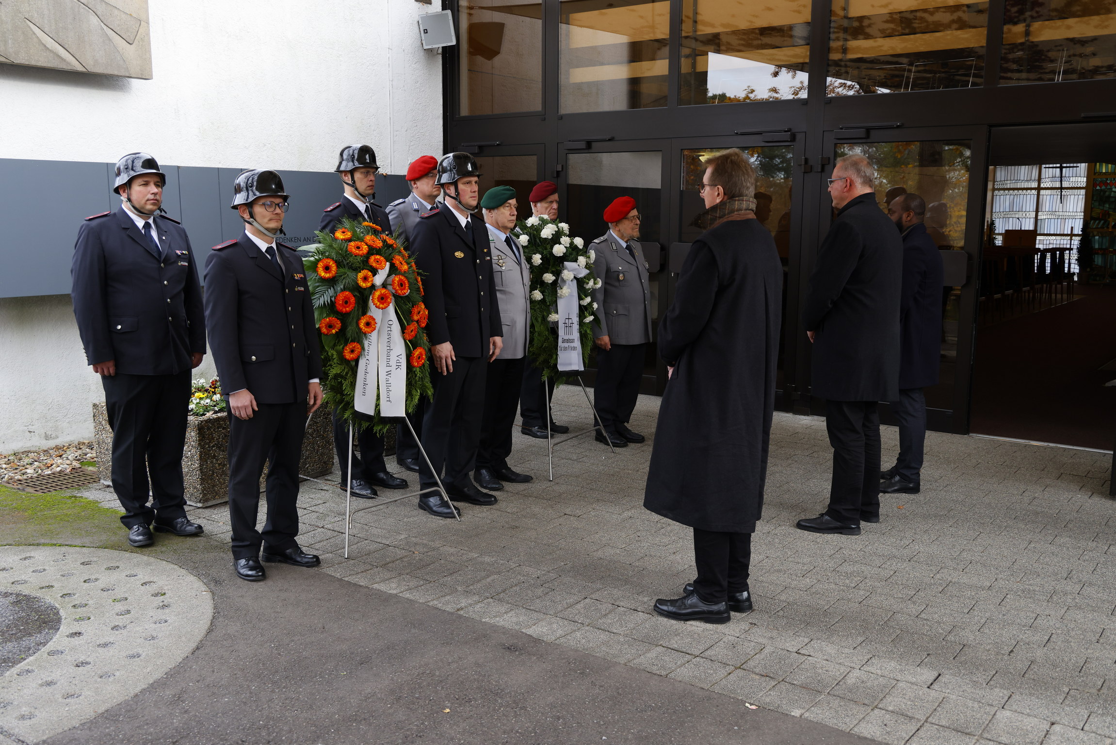 Mitglieder der Feuerwehr Walldorf sowie der Reservistenkameradschaft stellten während der Gedenkfeier in der Friedhofskapelle die Ehrenwache und trugen die Kränze zum Gefallenendenkmal. Dort wurden sie von Bürgermeister Matthias Renschler und dem Ersten Beigeordneten Otto Steinmann niedergelegt. Der Evangelische Posaunenchor begleitete die Zeremonie musikalisch, während die Anwesenden am Gefallenendenkmal einen Moment innehalten konnten.