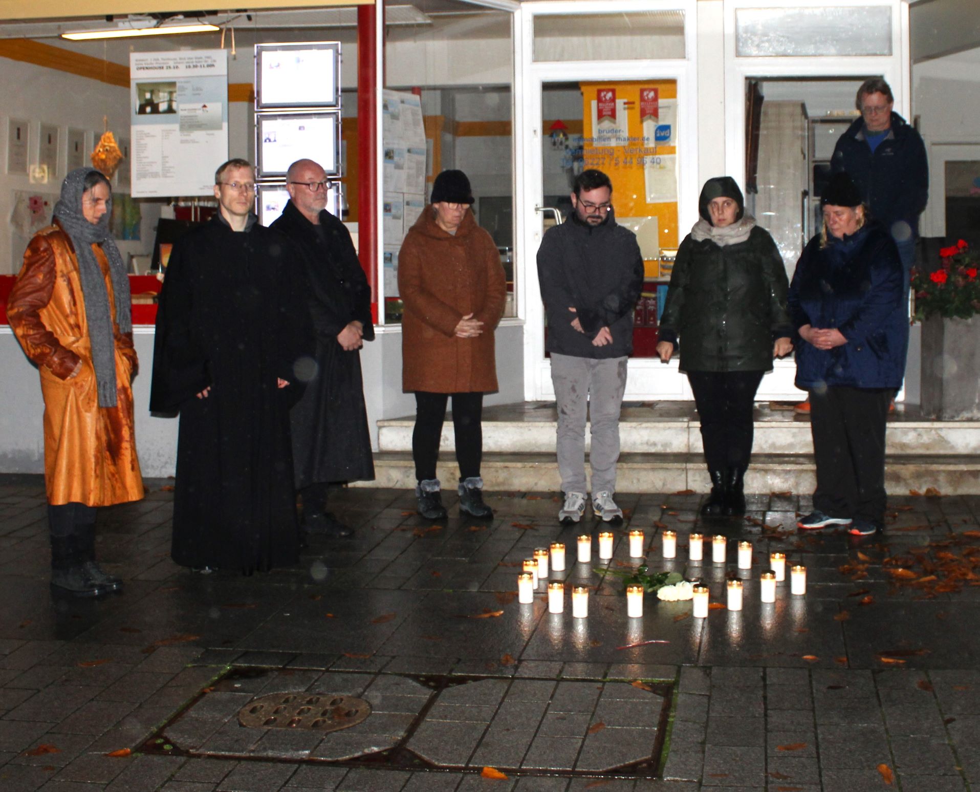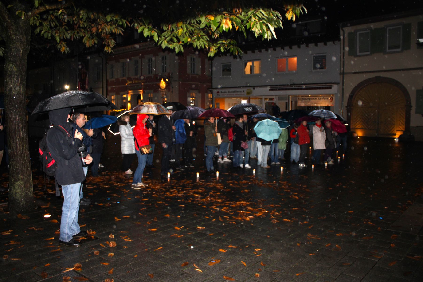 Mit Texten wie diesem erinnert der Verein Walldorf solidarisch auf dem Marktplatz gemeinsam mit mehr als fünfzig Zuhörerinnen und Zuhörern am 85. Jahrestag der Deportation an das schreckliche Geschehen, das sich nicht wiederholen soll. „Stellen wir uns vor, ein Überlebender wäre heute hier. Was würde er denken? Was würde er sagen, wenn er auf uns blickt?“, heißt es gegen Ende der szenischen Lesung, als die Organisatoren an den Stolpersteinen Rosen niedergelegt und einen Kreis aus Kerzen gebildet haben. „Ganz sicher würde er sagen: Euch trifft keine Schuld! Ihr könnt nichts für das, was damals geschehen ist. Aber ihr seid schuld, wenn es wieder passiert“, geben sie selbst die Antwort und Mahnung. Trotz Dauerregen haben alle Teilnehmer – unter ihnen auch Bürgermeister Matthias Renschler und der Erste Beigeordnete Otto Steinmann – ausgeharrt, haben die auch nach 85 Jahren immer noch betroffen machenden Texte auf sich wirken lassen und der zwischendurch eingespielten, dazu passenden Musik gelauscht.