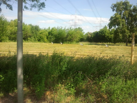 Dabei lässt sich regelmäßig beobachten, wie die in der Umgebung heimischen Störche diese frisch gemähten Flächen gemeinsam zur Nahrungssuche anfliegen und diese dann gleich zu mehreren nach Insekten und sonstigem Kleingetier absuchen.