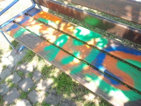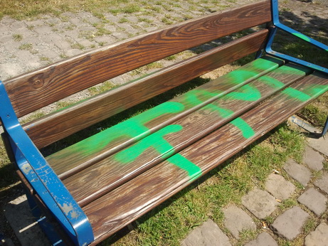 Unbekannte haben mit verschiedenen Spraydosen wahllos auf Bänken Treppenanlagen und Holztafeln Ihre „Markierungen“ hinterlassen.
