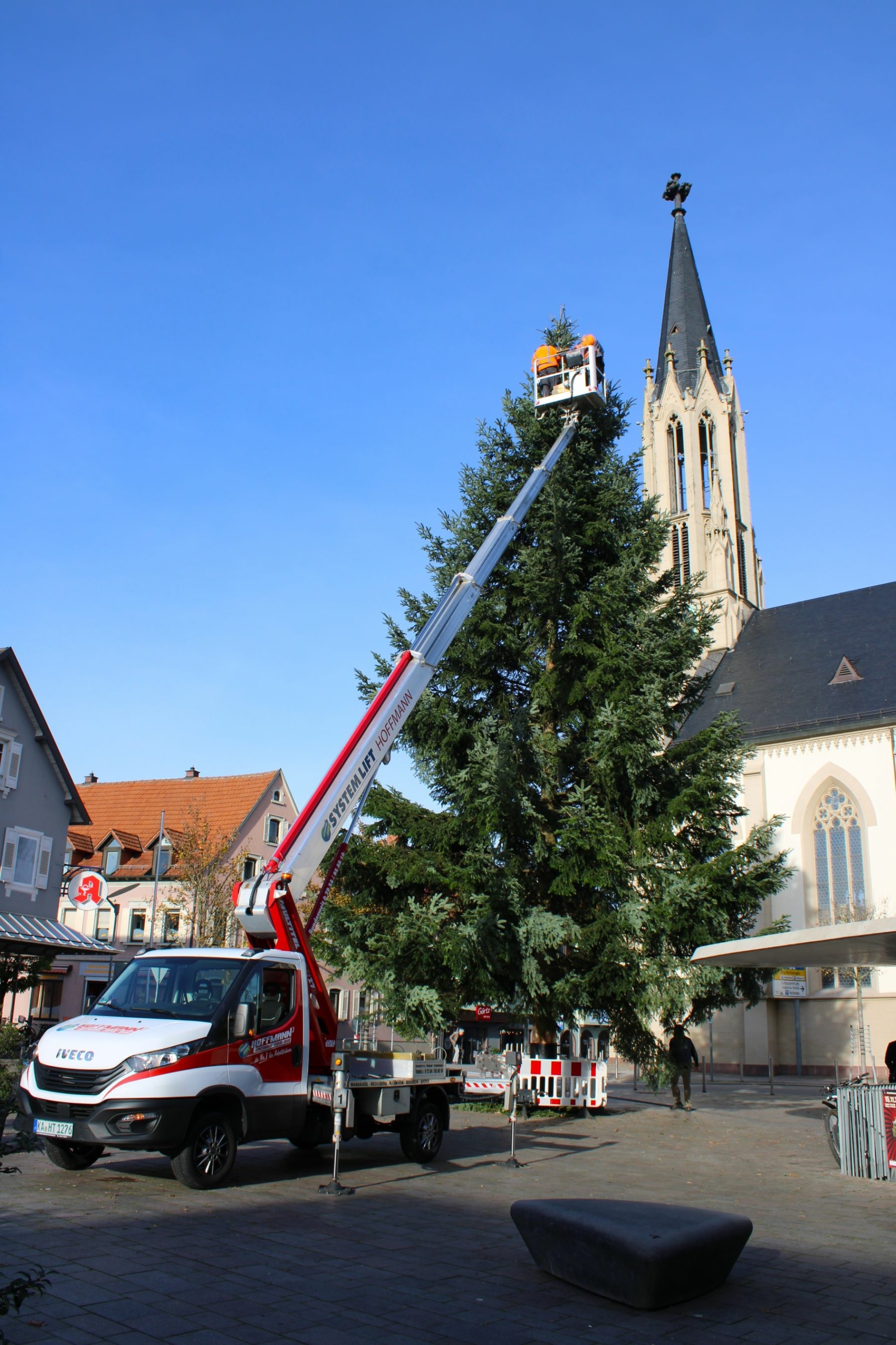 „Nach knapp sechs Stunden waren wir fertig“, sagt Schäffner über die Arbeiten. Nach der Anlieferung per Lastzug, dem Abladen und Aufstellen mit einem Kranfahrzeug mussten unter anderem die Stämme an den einzelnen Standorten noch zurechtgesägt und festgekeilt werden. An der Drehscheibe war auch der kommunale Vollzugsdienst im Einsatz, um die Straße kurz für die großen Fahrzeuge abzusperren. Am Mittwoch war der Bauhof dort dann schon wieder aktiv. Mit dem großen Steiger ging es für zwei Mitarbeiter in luftige Höhen, um mit dem Schmücken des Baums auf der Drehscheibe zu beginnen.