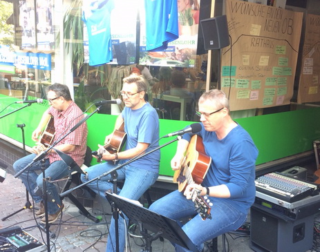 Kuchen und Getränke mit einem „grünen“ Anstrich wurden den vorbeilaufenden Bürgerinnen und Bürgern durch zahleiche UnterstützerInnen gereicht. Musikalisch trug die Gruppe slow hands mit den Musiker Jürgen Walther, Holger Zuber und Gregor Weisbarth zur guten Stimmung bei.