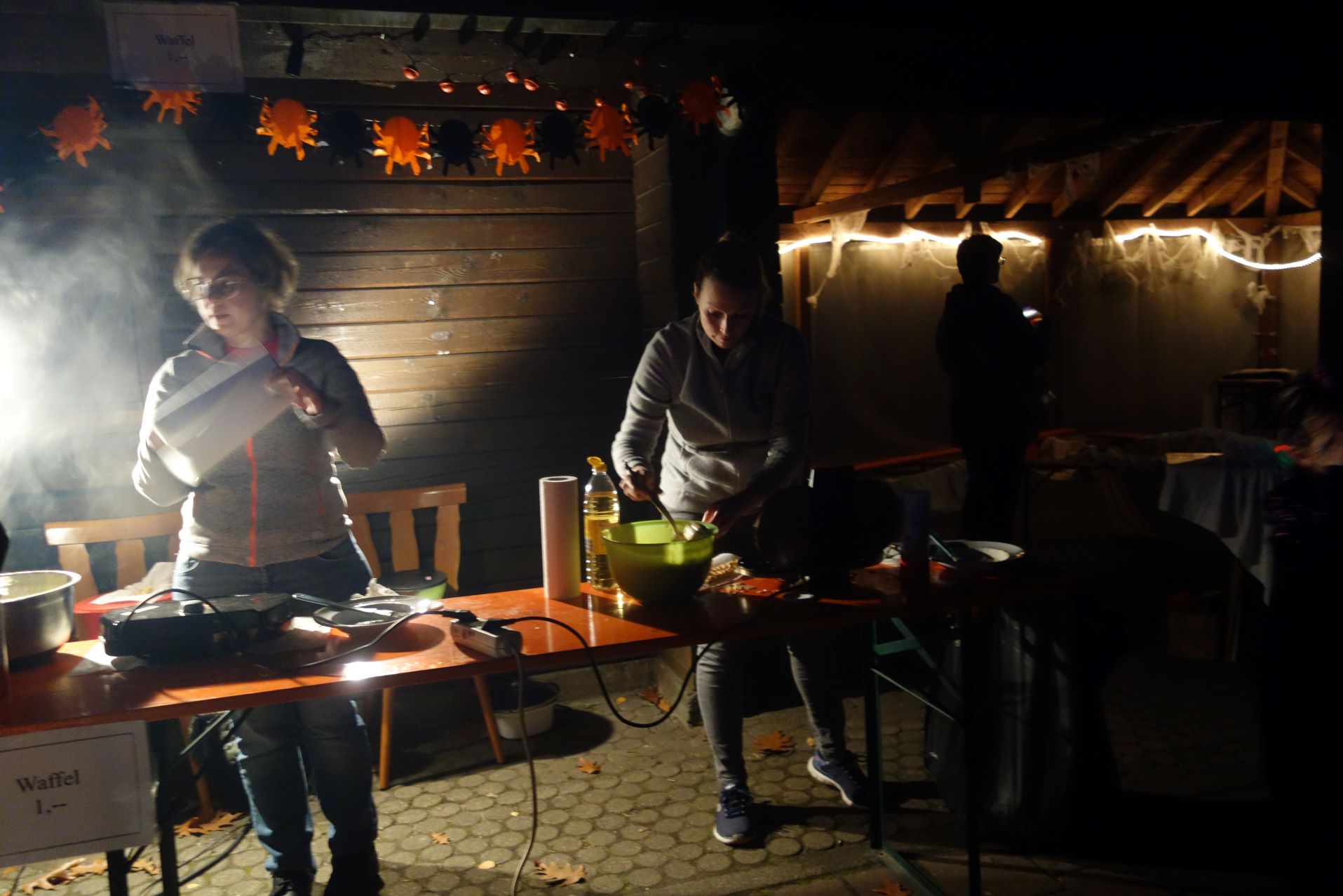 Für den kleinen Hunger zwischendurch gab es Kürbissuppe und heiße Würstchen (Hexenfinger) von der Abt. Turnen sowie Punsch und kalte Getränke von der Abt. FuK. Knusprige Waffeln von der Abt. Handball Damen sorgten für einen süßen Genuss.