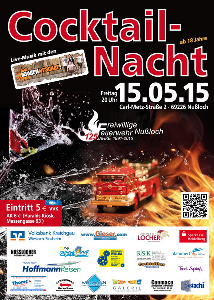 Die Freiwillige Feuerwehr Nußloch veranstaltet am Freitag, den 15.05.2015 ihre alljährliche Cocktail-Nacht. Angefangen mit Alpenrock & Volksmusik, Partykrachern aus der Aprés-Ski-Szene, über die angesagten Pop-, Rock- und Discohits der vergangenen Jahre bis hin zu den brandaktuellen Charts, ist für jeden etwas im Gepäck!