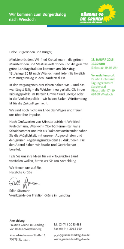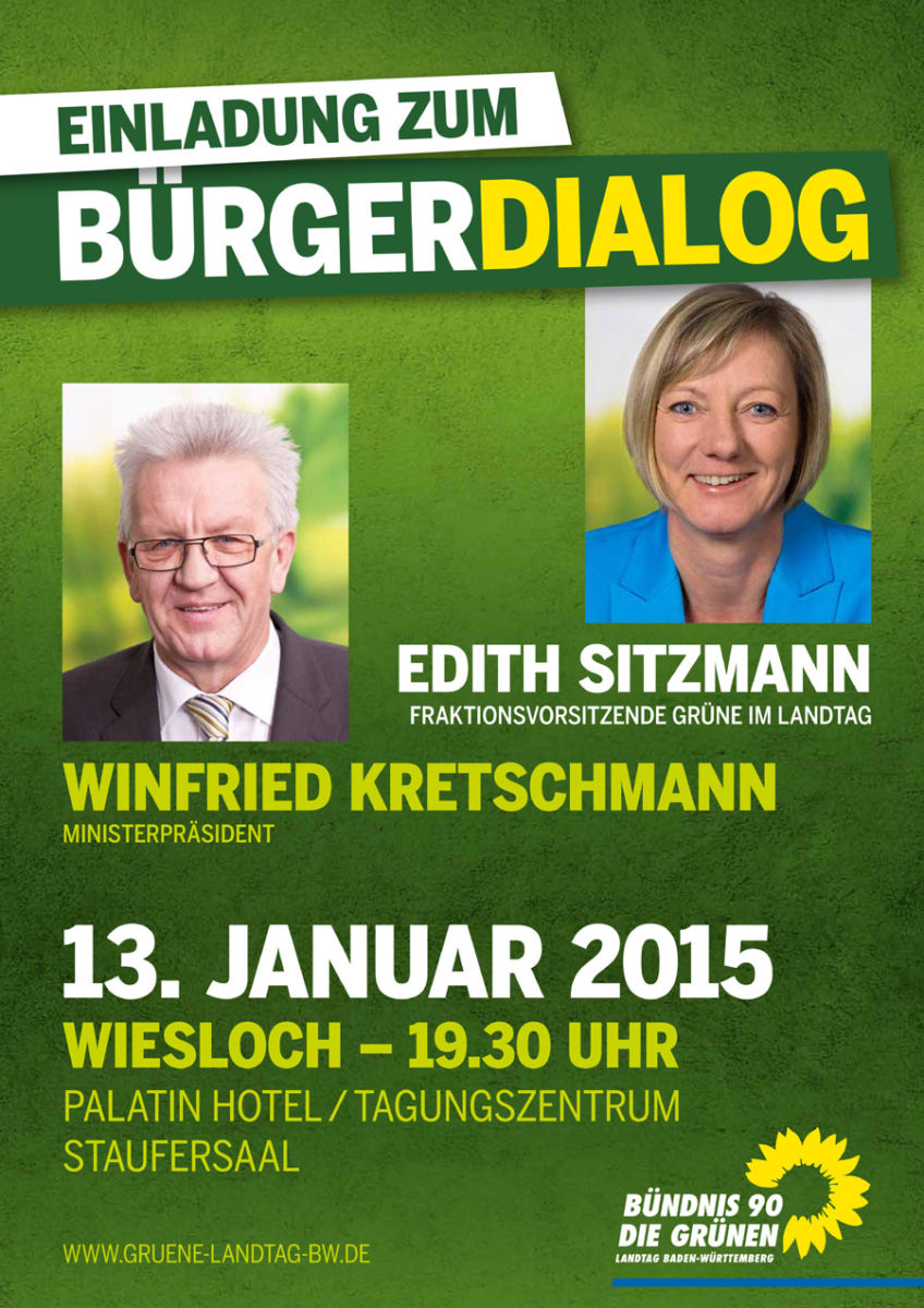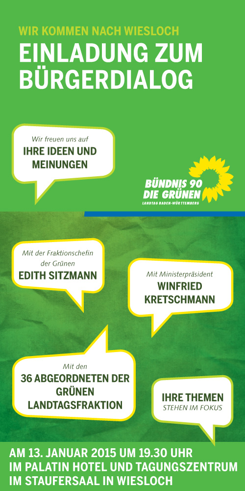 „Am 13. Januar 2015 möchten wir beim grünen Bürgerdialog Sie, die Bürgerinnen und Bürgern aus Wiesloch und Umgebung, kennenlernen und mit Ihnen diskutieren.“