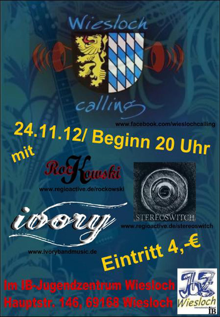 Die Veranstaltungsreihe des JuZ „Wiesloch Calling“ bietet heute wieder regionalen, jungen Bands eine musikalische Plattform. Diesmal sind Rockowski (Rock, Pop aus St. Leon-Rot), Ivory (Alternative Rock aus Reilingen) und Stereoswitch (Alternative NuRock aus Worms) am Start.