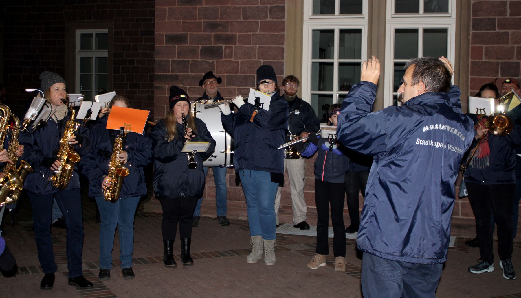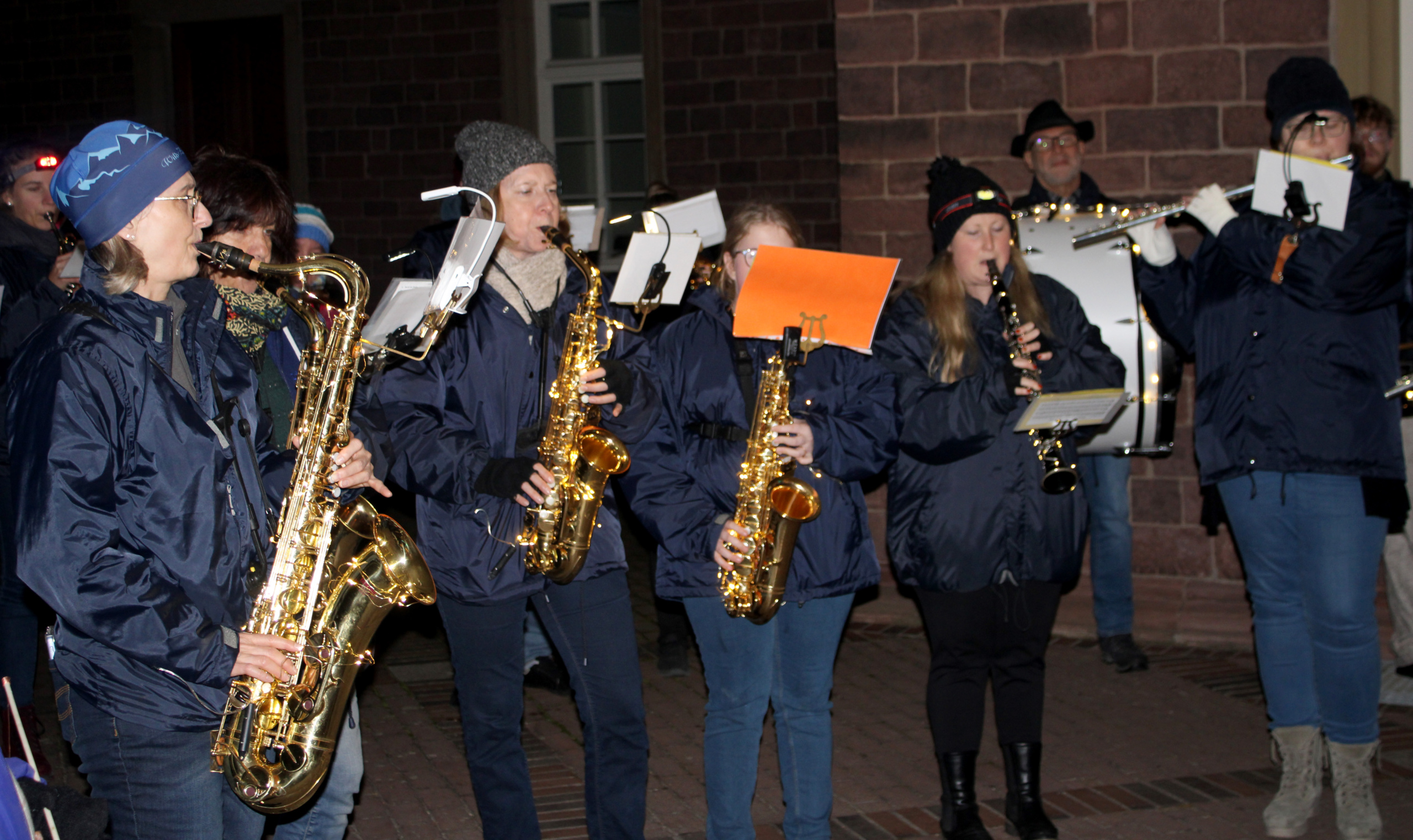 Während sich die Kinder der Theater-AG der Waldschule noch vorbereiten, stimmt der Musikverein Stadtkapelle auf den bevorstehenden Auftritt schon einmal musikalisch ein. Mit Klassikern wie „Laterne, Laterne“ oder „Sankt Martin“ setzt man auf altbekanntes und beliebtes Liedgut. Vor der Bühne hinter dem Astorhaus haben sich bereits Dutzende Menschen versammelt, um das Martinsspiel zu verfolgen, das den Martinszug traditionell einleitet.