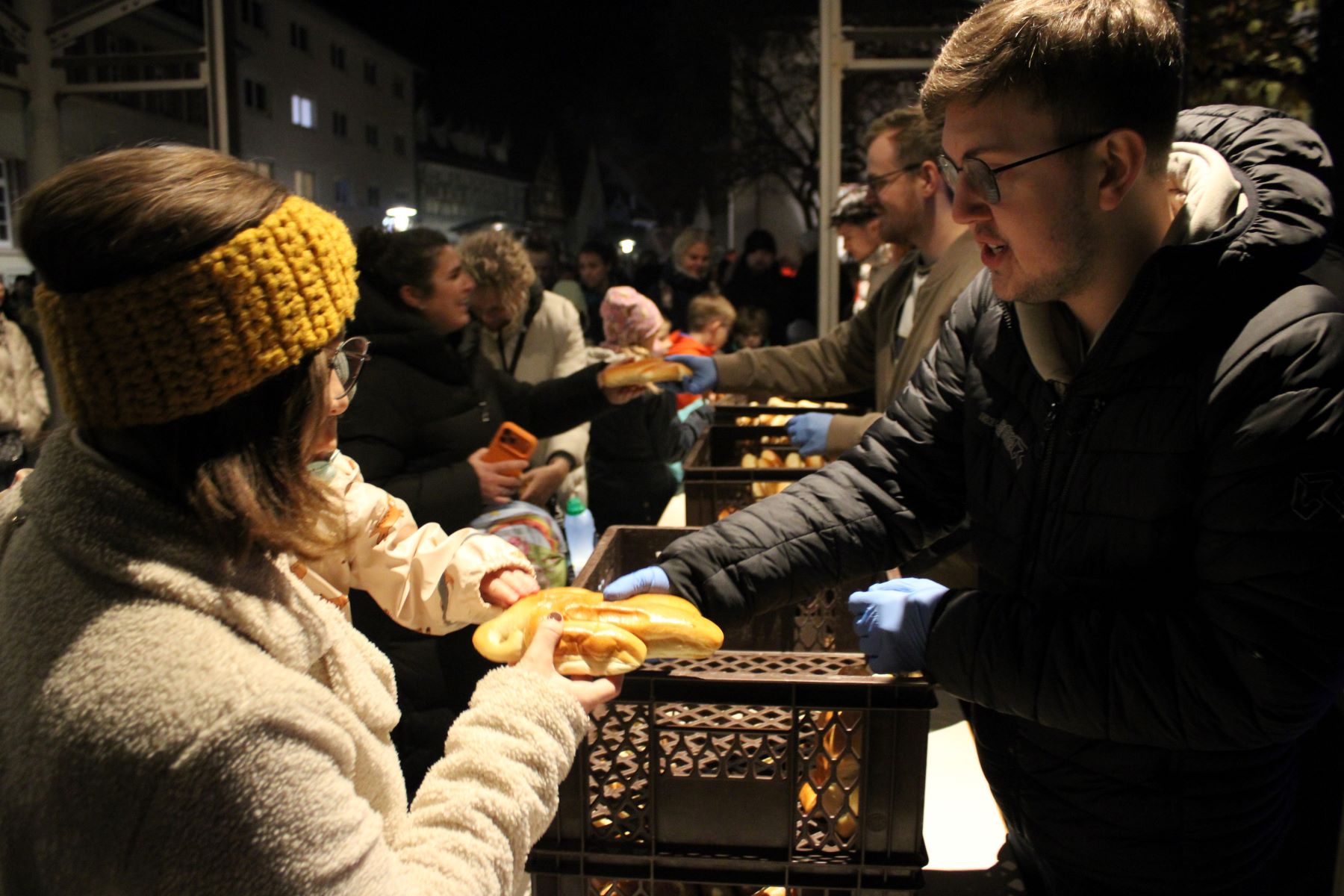 Ziel des Martinszugs ist der Marktplatz, wo sich die Stadtkapelle vor der katholischen Kirche noch einmal aufstellt und eine musikalische Umrahmung bietet, während sich die Teilnehmenden Martinsmännchen abholen dürfen, die von Auszubildenden und Mitarbeitern der Stadt verteilt werden.