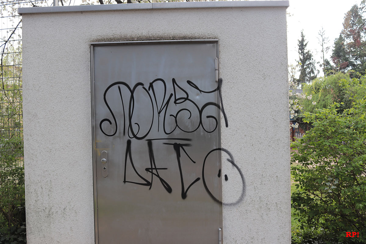 Es wurden Schmierereien in den Farben lila, schwarz, weiß und grün an Fassaden, Verkehrszeichen, einem Mülleimer und einem Stromverteilerkasten festgestellt. Nachdem die Polizei von einem Zeugen alarmiert wurde, fahndeten sie sofort nach den Tätern und konnten einen 17-jährigen Tatverdächtigen vorläufig festnehmen. Bei ihm wurden zahlreiche Graffiti-Utensilien gefunden und anschließend wurde seine Mutter informiert, die ihn abholte.