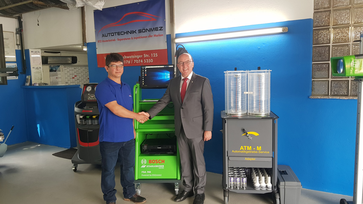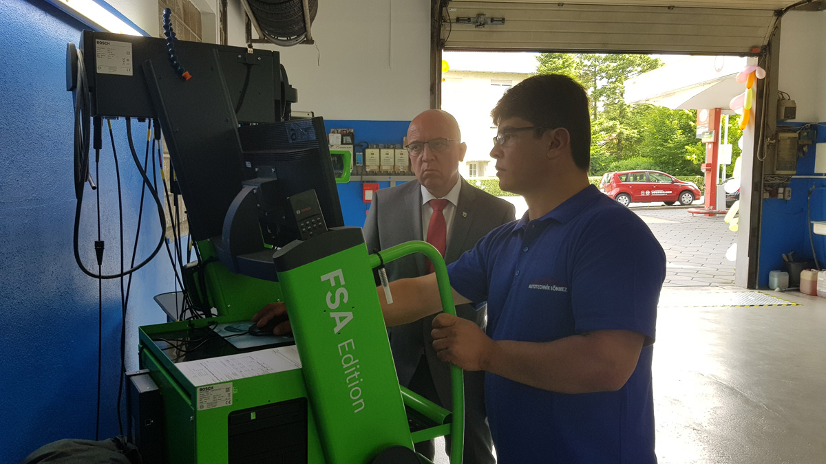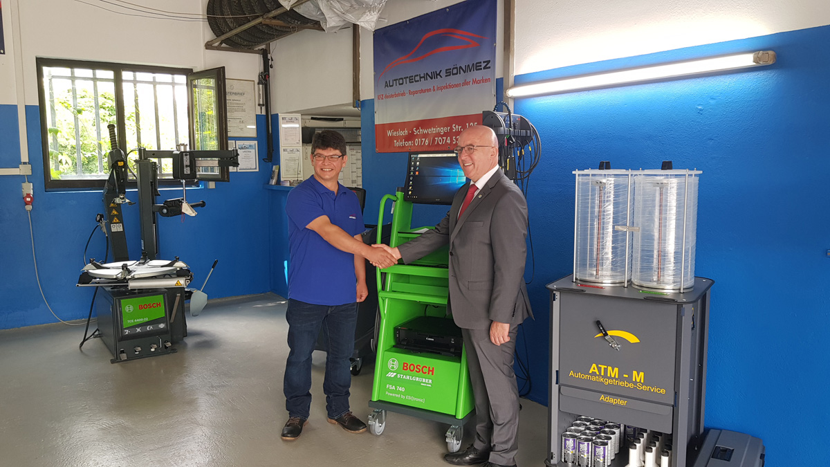 Bürgermeister Sauer gratulierte Kfz-Meister Sönmez und wünschte diesem auch weiterhin viel Erfolg. Er freue sich, so Sauer, daß der Werkstattbetrieb nachdem der Vormieter umgezogen ist, seit Ende 2016 von Sönmez weitergeführt wird, dieser sich etabliert hat – und jetzt auch noch beträchtlich in den Standort investiere.