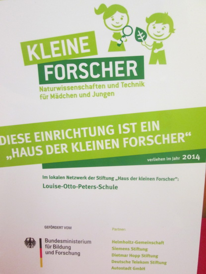 Jetzt war es wieder soweit und unsere Einrichtung wurde wiederholt zum „Haus der kleinen Forscher“ ausgezeichnet. Dies ist eine sichtbare Anerkennung für die regelmäßige Durchführung und Dokumentation unserer naturwissenschaftlichen Projekte. Daniela Pelzl vom lokalen Netzwerk der Stiftung an der Louise-Otto-Peters-Schule kam in den Kindergarten um den Sonnenkindern im Rahmen einer Experimentierstunde die Plakette zu überreichen.