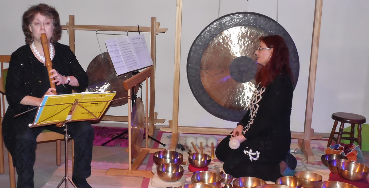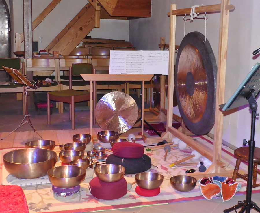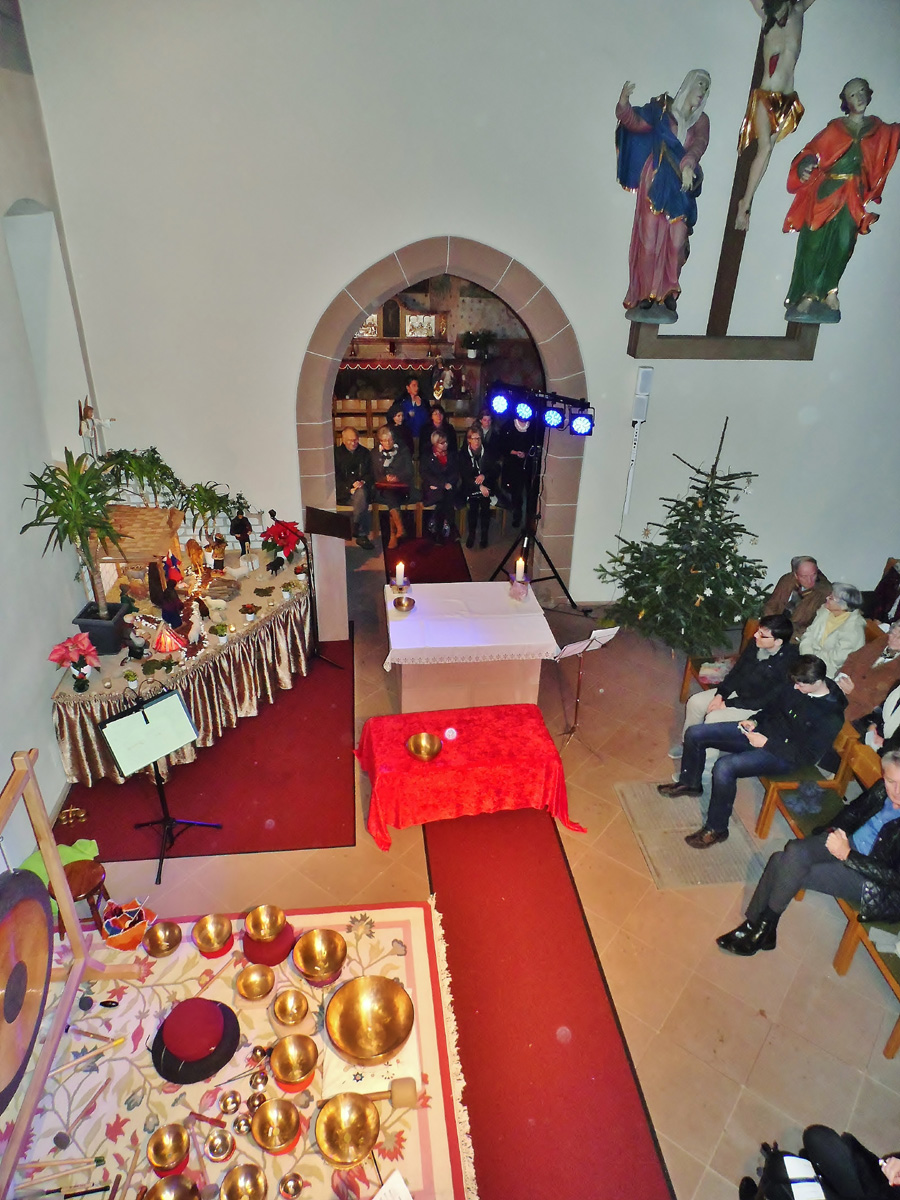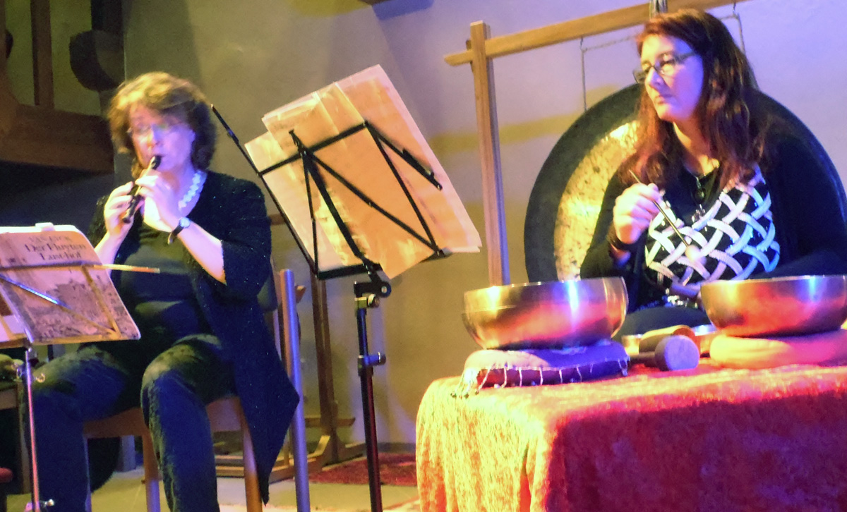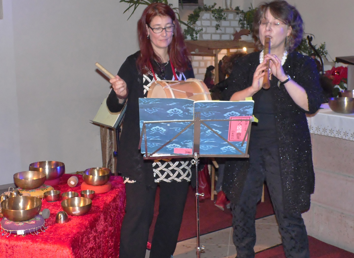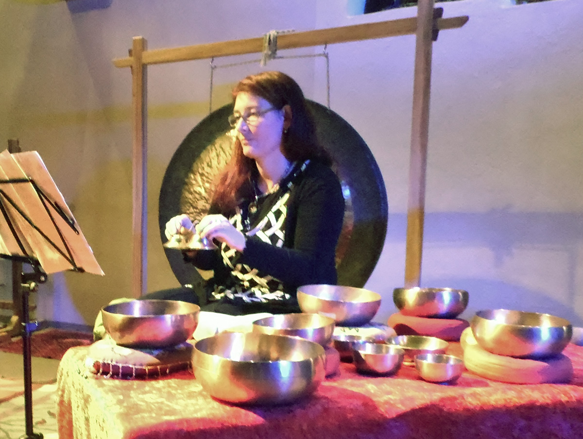 Nach den Begrüßungs-Worten von Pfarrer Hafner stellte Martina Pracht die unterschiedlichsten Klang-Instrumente durch Hörbeispiele vor, gefolgt von dem japanischen Volkslied: Horsewalker’s song und Improvisationen für Klangschalen und Gongs. Man spürte da bereits, dass die Zuhörer verzaubert lauschten.