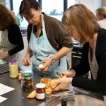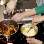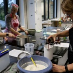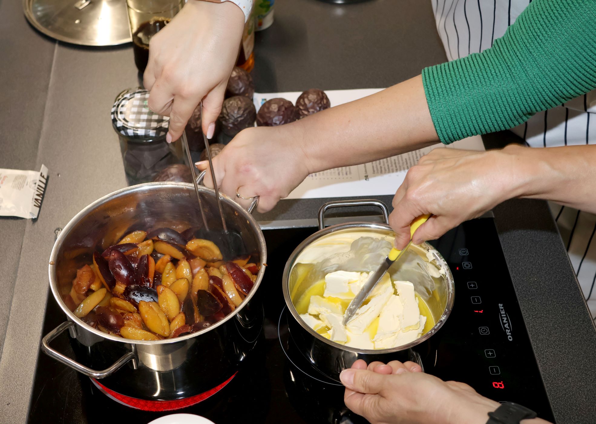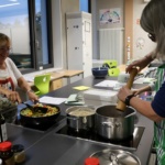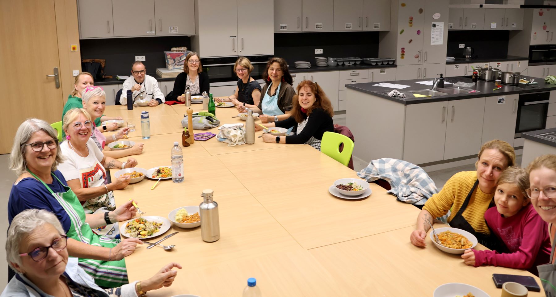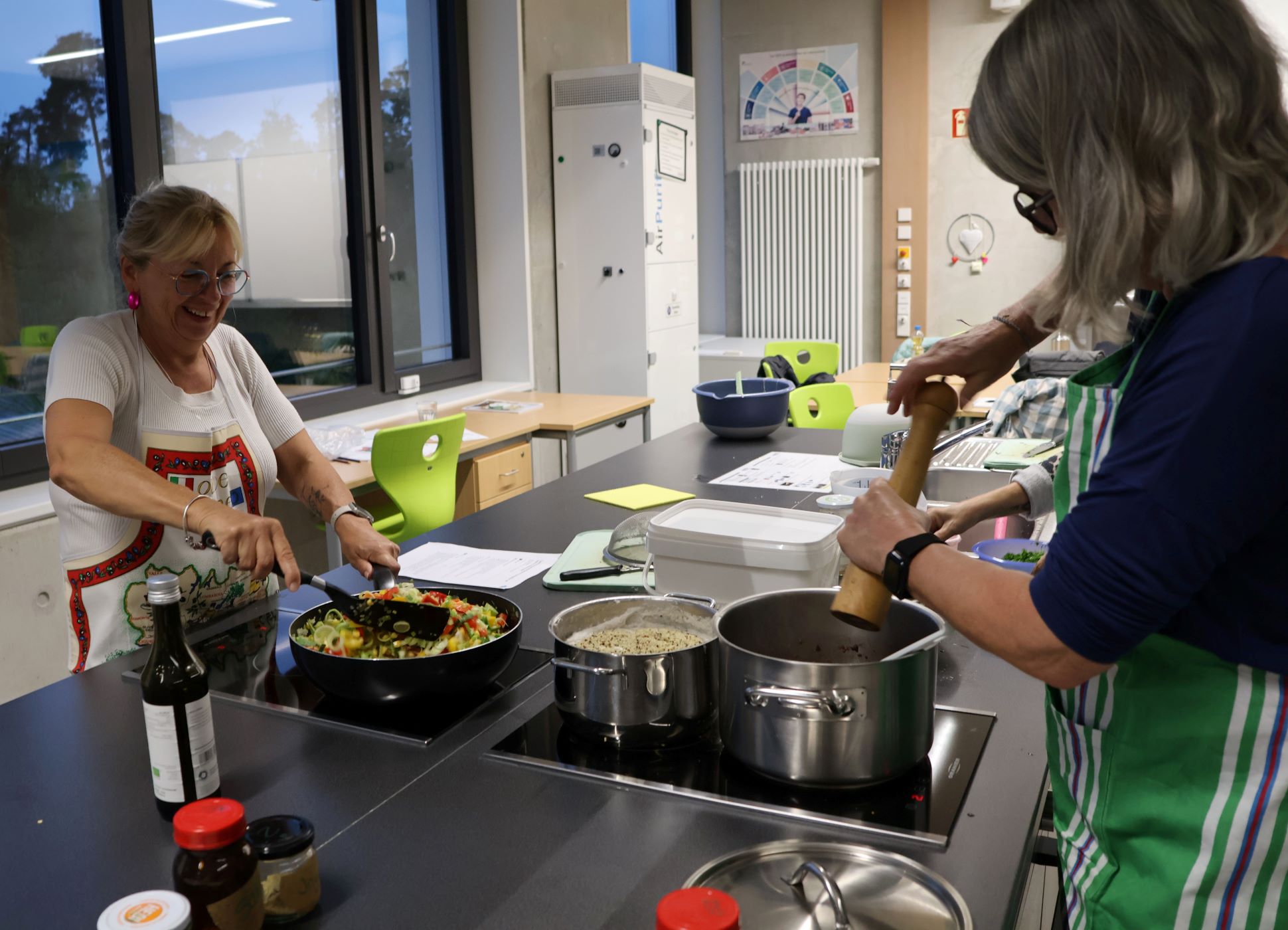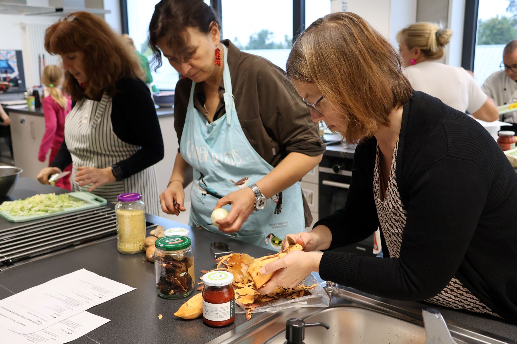 Schnell waren die Aufgaben für die Teilnehmenden verteilt: Gemüse waschen, schälen, klein schneiden, Wasser aufsetzen, Portionen abwiegen, Zutaten anbraten, Teig anrühren. „Gar nicht so einfach, wenn man sich in einer fremden Küche befindet“, stellte eine Teilnehmerin schmunzelnd fest. Nach einigen prüfenden Blicken in die Schränke wurden die passenden Utensilien aber gefunden und Messer, Messbecher, Töpfe, Pfannen und Schüsseln hervorgeholt.