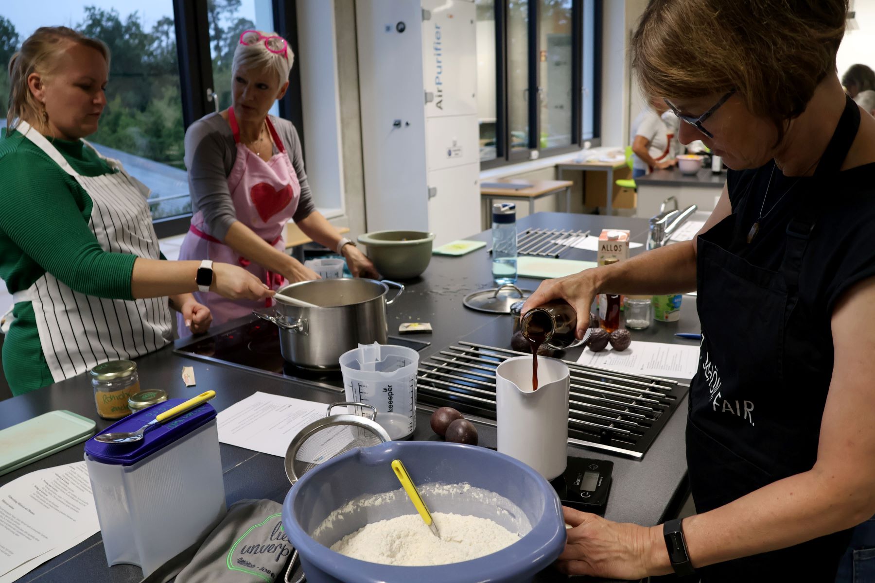 In der Küche herrschte schnell rege Betriebsamkeit und viele angeregte Gespräche entstanden. Wie das Essen wohl schmecken mag? Espresso im Pfannkuchenteig – passt das? Wie lange muss der Wirsing kochen? Es wurde gefachsimpelt, aber auch Persönliches ausgetauscht. Einige der Teilnehmenden hatten schon Erfahrung mit einem Kochkurs gemacht. So wie Tina Fillinger, die sich für den Kurs angemeldet hatte, weil sie vegetarisches und regionales Essen „immer gut“ finde. Sie habe auch gereizt, neue Rezepte auszuprobieren. „Mir ist der faire Handel wichtig“, sagte Teilnehmerin Gabi Krämer de Carrasco, die sich in der Fairtrade-Steuerungsgruppe engagiert. Besonders begeistert sei sie von den Espresso-Crêpes.