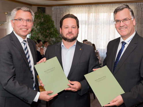 Minister Bonde übergibt Förderbescheide für Planungsleistungen. Verbandsvorsitzender Landrat Dallinger und Prof. Dr. Anders befürworten den eingeschlagenen Weg des Kreises. Gemeinsame Gesprächsrunde mit kommunaler und gewerblicher Seite zeigt Bedarf und Bedeutung von glasfaserbasiertem Breitband.