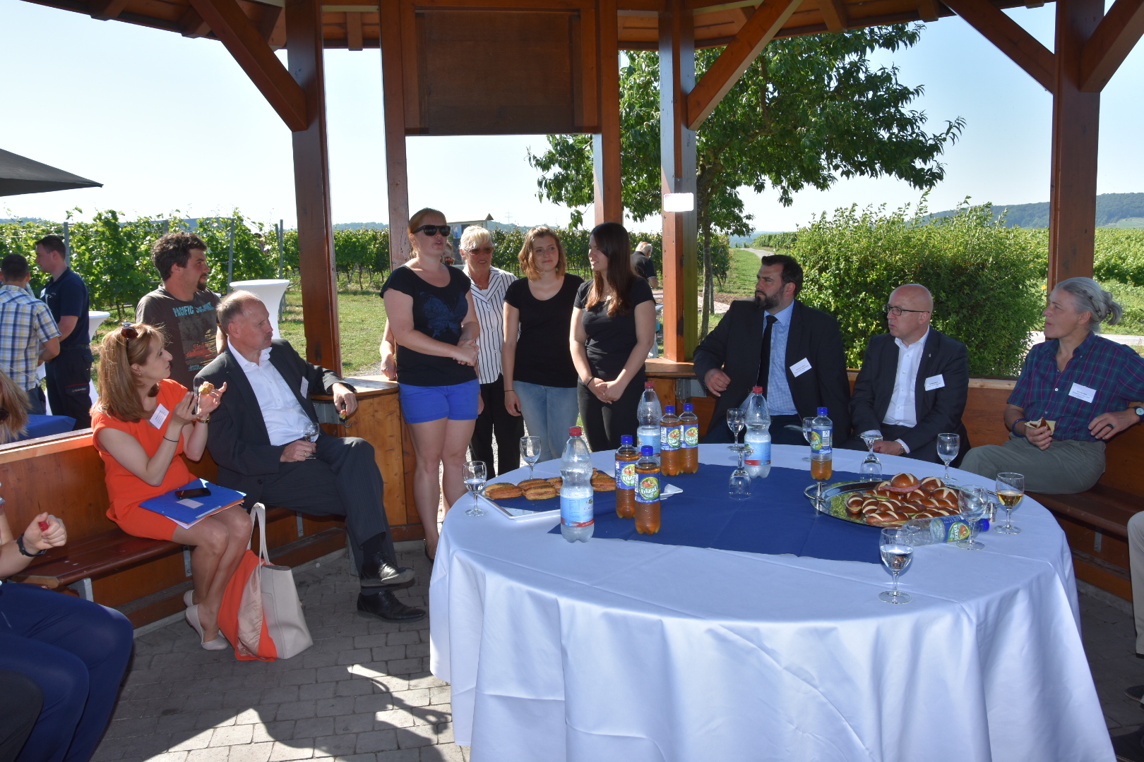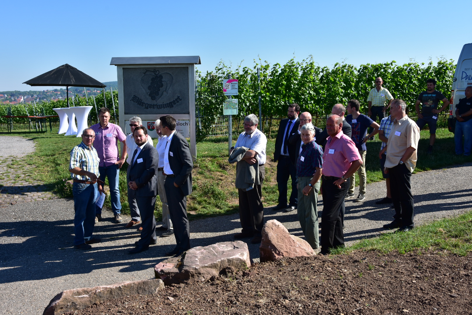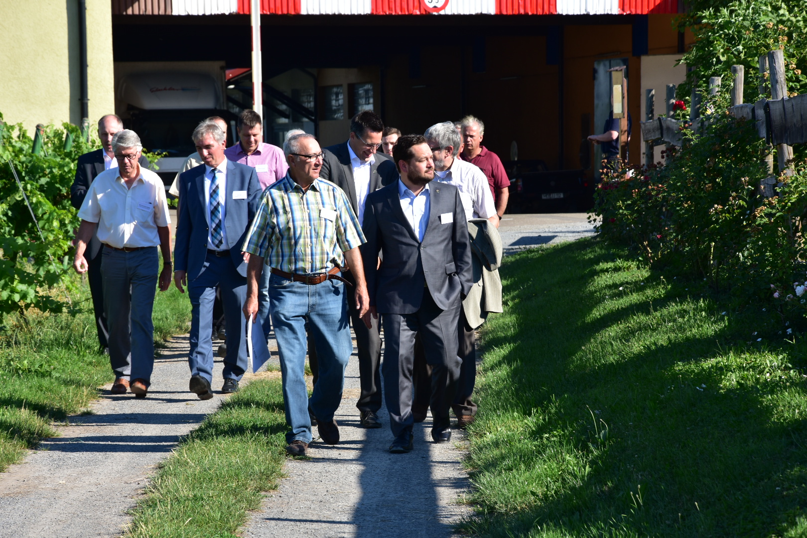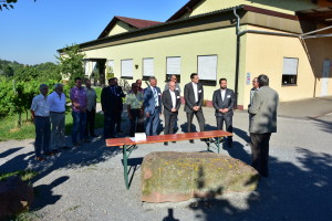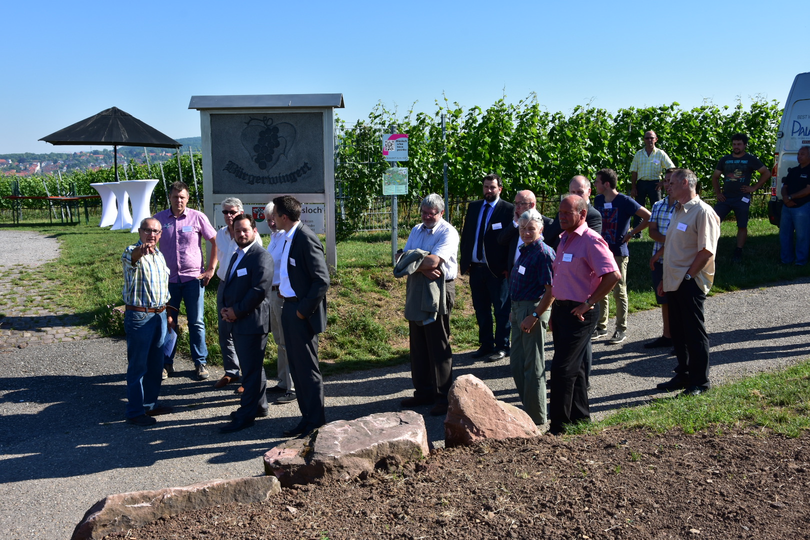 Bei schönstem Sommerwetter konnten Oberbürgermeister Franz Schaidhammer, die beiden Landtagsabgeordneten Karl Klein und Kai Schmidt—Eisenlohr, sowie Bürgermeisterstrellvertreter Christian Kollenz aus Rauenberg den Gast aus Stuttgart am Winzerkeller in Wiesloch begrüßen. Darüber hinaus waren der Initiator Rainer Kircher, Bürgermeister Ludwig Sauer, Mitglieder der Verwaltung und Vertreter des Winzerkellers zu diesem Besichtigungstermin gekommen.