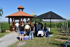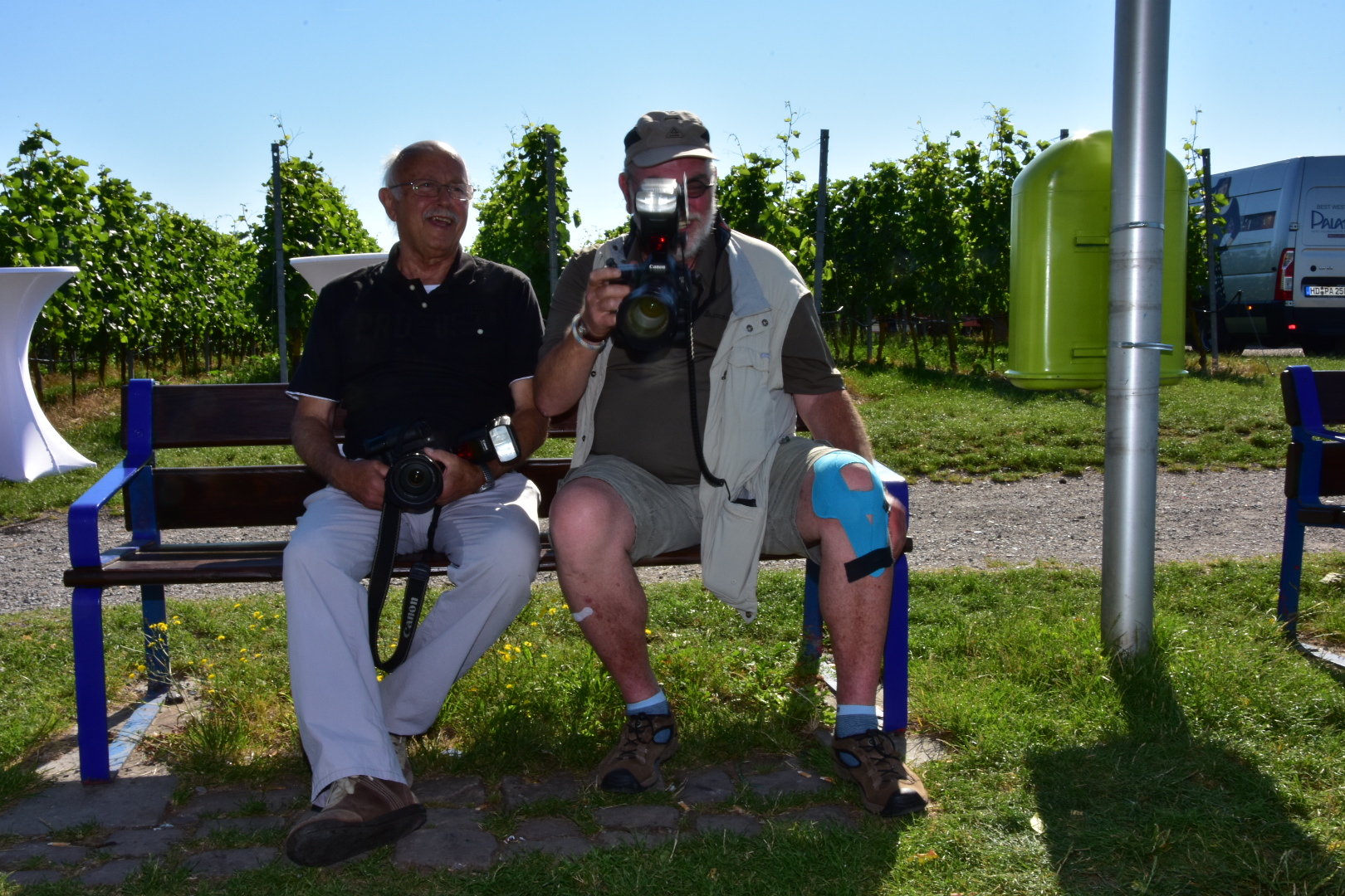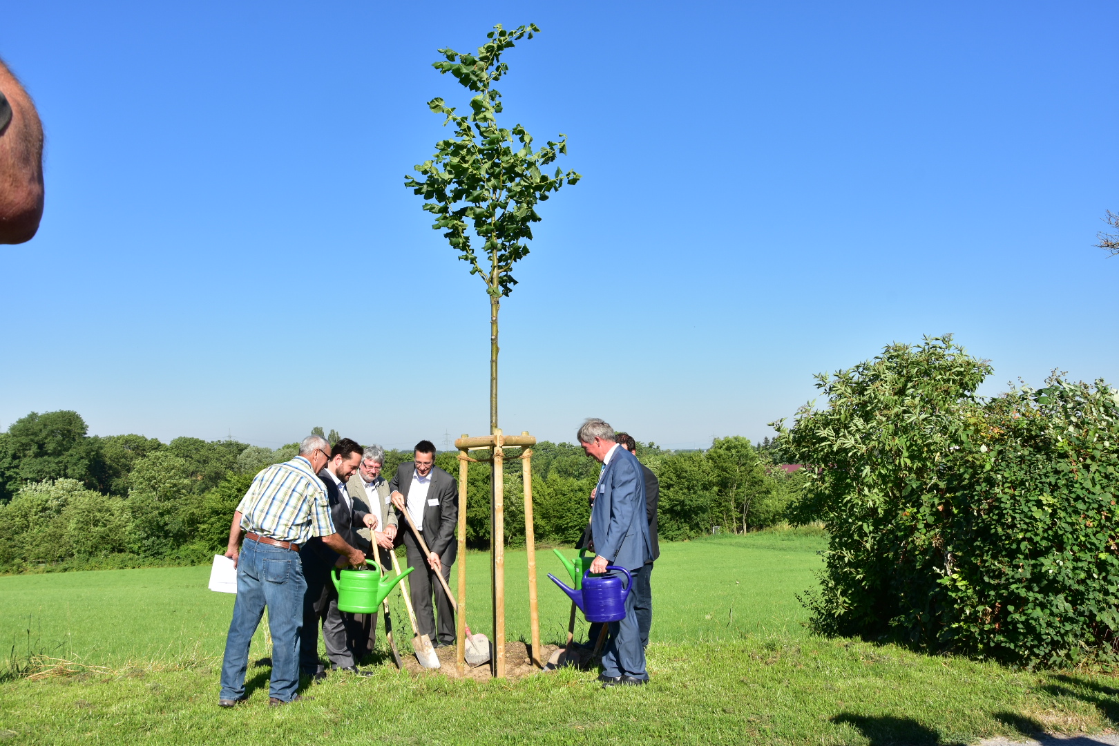 Zu Fuß ging es dann die ersten hundert Meter bis zu einer Pflanzstelle für eine Sommerlinde oberhalb des Bögnerweges. Diese wurde dann gleich durch die politischen Vertreter und den Minister gepflanzt und angegossen. Rainer Kircher nutzte die Gelegenheit dem Minister die Grundzüge seiner ehrenamtlichen Projekte zu erläutern. „Allein schaffe ich das nicht, das geht nur gemeinsam mit vielen Beteiligten und Mitwirkenden, die Sie hier sehen“. Bei einer gemeinsamen Rundfahrt durch die Weinberge mit wunderschönen Ausblicken zu den Nachbargemeinden Rauenberg und Dielheim wurden dann die einzelnen Projekte und Anlagen entlang des sogenannten Bacchusweges vorgestellt. Ziel war das Bussierhäusel und der neu hergerichtete Platz für die Bacchusfigur aus rotem Sandstein, die dort in wenigen Wochen aufgestellt werden soll. Der Künstler Pit Elsasser stellte seinen „Speedy-Bacchus“ den interessierten Gästen vor. Im Anschluss daran setzte man sich in das schattige und luftige Bussierhäusel, um den vormittäglichen Ausflug mit Wasser und Apfelschorle ausklingen zu lassen. Oberbürgermeister Franz Schaidhammer erläuterte die dabei Initiativen der Stadt zu den Themen Weinbau, Naherholung und Tourismus. Es gehe immer auch darum, einen Mehrwert für die Bevölkerung, aber auch für die Beherbergungsbetriebe zu generieren und damit auch die Identifikation mit dem hier erzeugten Wein zu verbessern. Die Projekte mit dem „Bürgerwingert“ Wiesloch“ und „Bürgerwingert Walldorf „ haben entscheidend zu dieser Identifikation mit dem heimischen Weinbau und seiner Landschaft beigetragen.