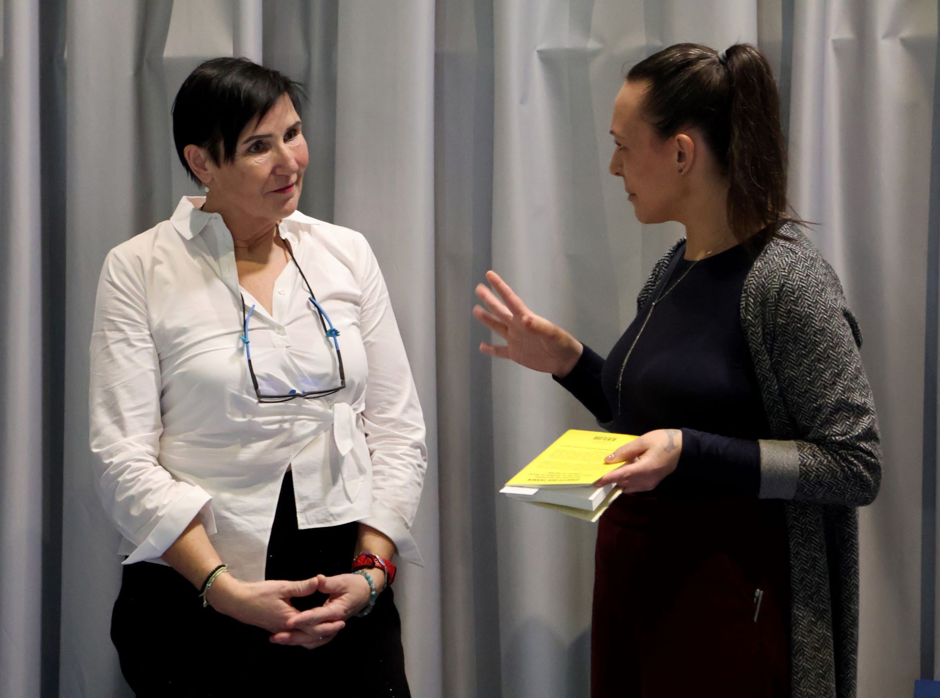 Erika Pattis selbst sagt, dass sie schon in der Schulzeit ein Buch schreiben wollte. Beruflich habe sie aber einen ganz anderen Weg eingeschlagen und sich zur Maschinenbaumechanikerin ausbilden lassen. „Jenseits der Tränen“ ist ihr Debütroman. „Es war ein langer Weg zum Buch“, sagen beide über den gegenseitigen Austausch und den Schreibprozess. „Jetzt sind wir Freunde geworden“, sagt Susanne Schwarz, als sie auf der Bühne neben der Autorin steht, und freut sich darüber, dass „viele für mich wichtige Menschen heute da sind“.