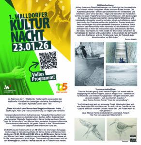 Im Rahmen der Walldorfer Kulturnacht findet in der Alten Apotheke eine Lesung und Ausstellung statt. Die ehemalige Gastkünstlerin Sanna Konda liest aus ihrem Roman „Insel der Verwandlung“ (SKN Verlag, 2025). Marcus Heim liest aus seiner Kurzgeschichtenreihe „Revolutionäre Lebensläufe“. Darin schreibt er seinen mal mehr und mal weniger prominenten Protagonisten alternative Lebensläufe auf den Leib. Diese sind immer frei erfunden, bisweilen fantastisch, und enden alle tödlich.