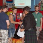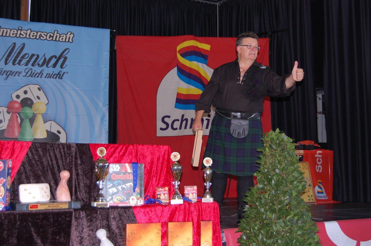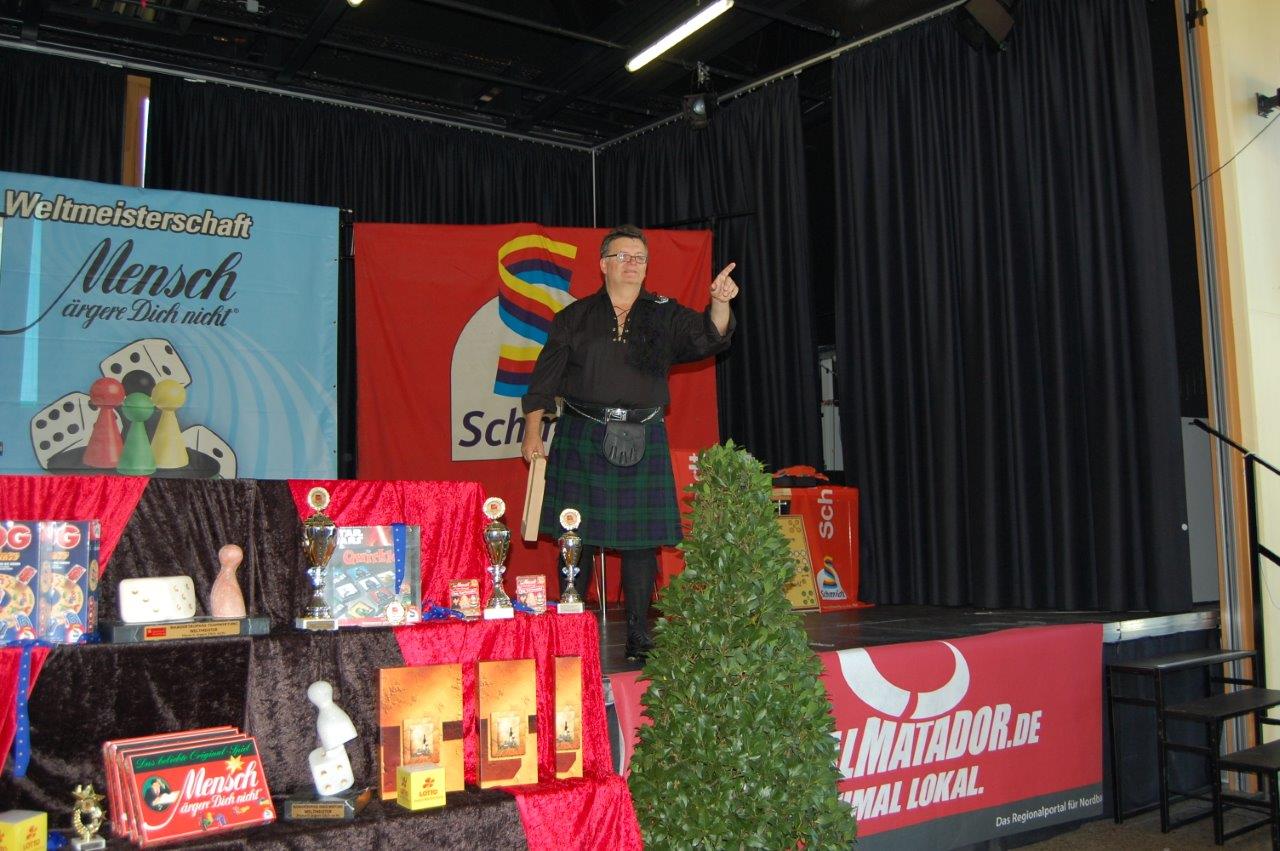 Das Ereignis fand dieses Jahr gegen die Gewohnheit nicht in der Eisweinhalle statt, sondern in der Mensa des Ottheinrich-Gymnasiums in Wiesloch. Um 13:00 Uhr trudelten die letzten Kurzentschlossenen ein, die sich wohl ein wenig „ärgern“ lassen wollten. Im Getümmel findet man unter anderem Hauptorganisator Andreas Grimm auf. Nicht unerwähnt sollte man hier lassen, dass er einen Schottenrock trägt. Richtig gelesen. „Ich habe eine Wette verloren“. Gesteht er grinsend. Er hatte sich erhofft, dass sich dieses Jahr zur Weltmeisterschaft ein Schotte anmeldet und mitspielt. Dem war nicht so und da ein Mann zu seinem Wort steht, sorgte er selbst für einen schottischen Flair.