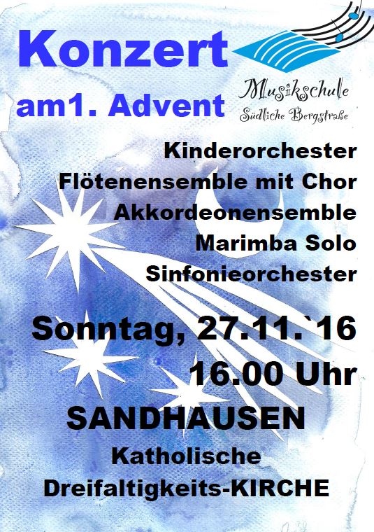 msb_konzertBeim Adventskonzert am Sonntag, 27.11.16 werden um 16.00 Uhr in der Kath. Kirche in Sandhausen Kinderorchester, Flötenensemble mit Chor, Akkordeonensemble, Marimba Solo und das Sinfonieorchester zu hören sein.